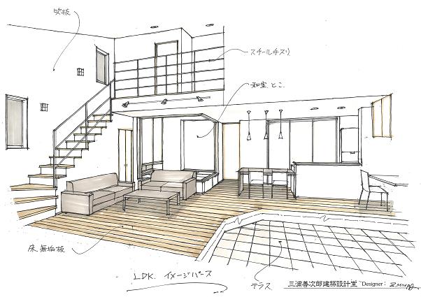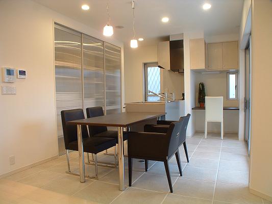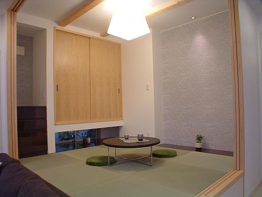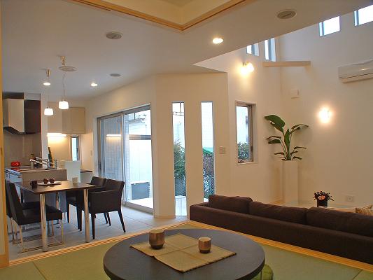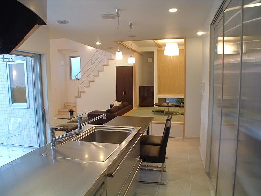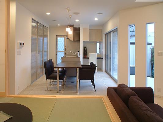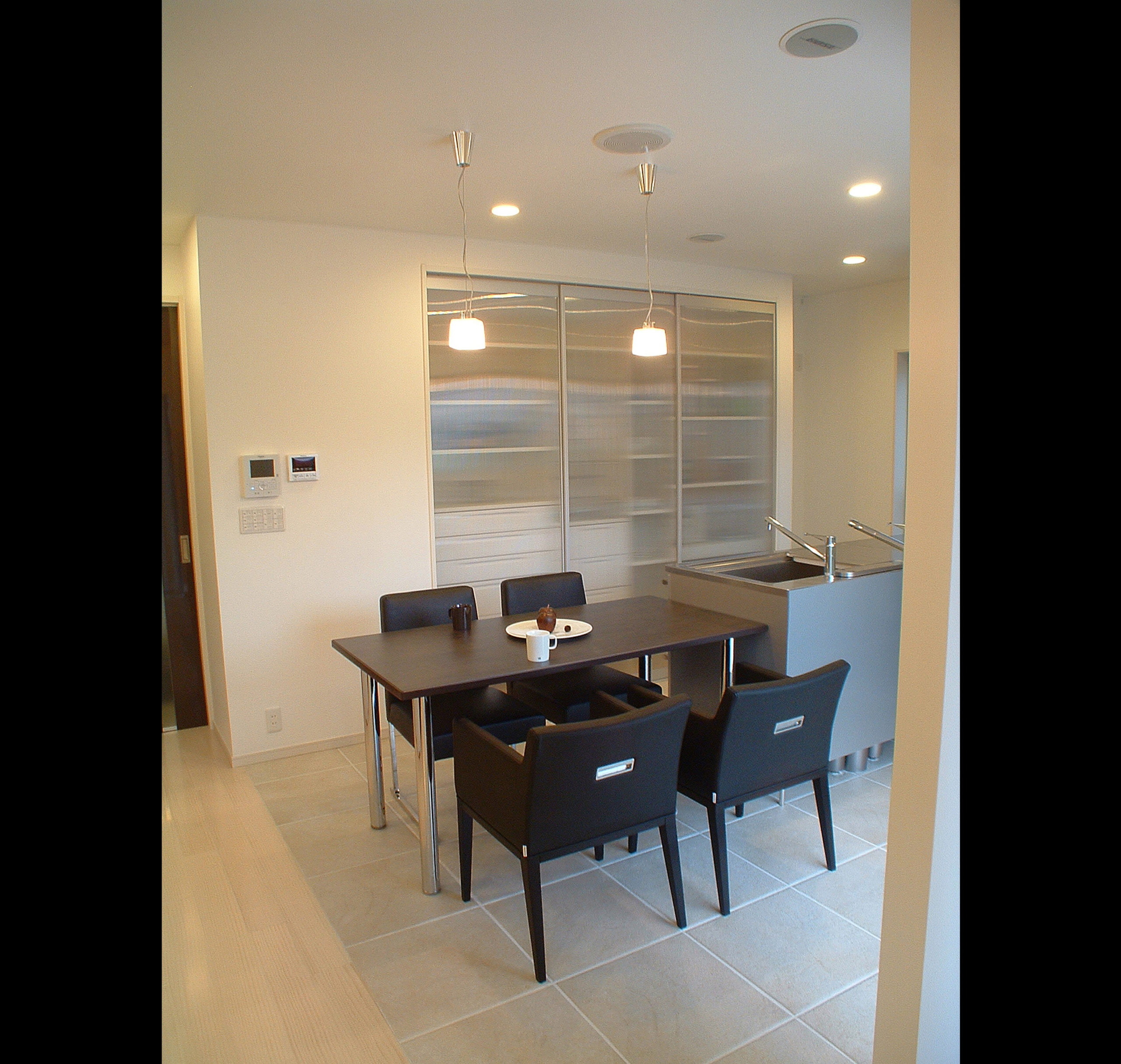 ダイニングキッチンの南側に大きな開口部を設け外部の小庭と続けることで視線が通り更に開放感が増すようにし、LDKと続き間の日頃オープンで使う和室は、床を少し上げ下を収納に、間仕切り障子の鴨居は天井に埋込み違和感を無くし開放的に感じるよう計画した。