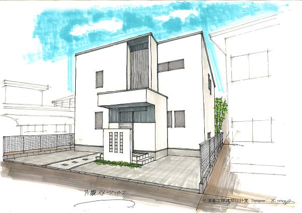 リビングを南側の境界付近まで寄せ、隣家からの視線を避けるため1階のリビングの南側の壁にはあえて窓は取り付けず、上部に吹抜を設け高窓から光を取り入れ、夏は陽の光を遮り、冬はリビングと続き間の北側の和室にも陽の光が落ちるように、屋根の軒先の出と高窓の高さを検討。