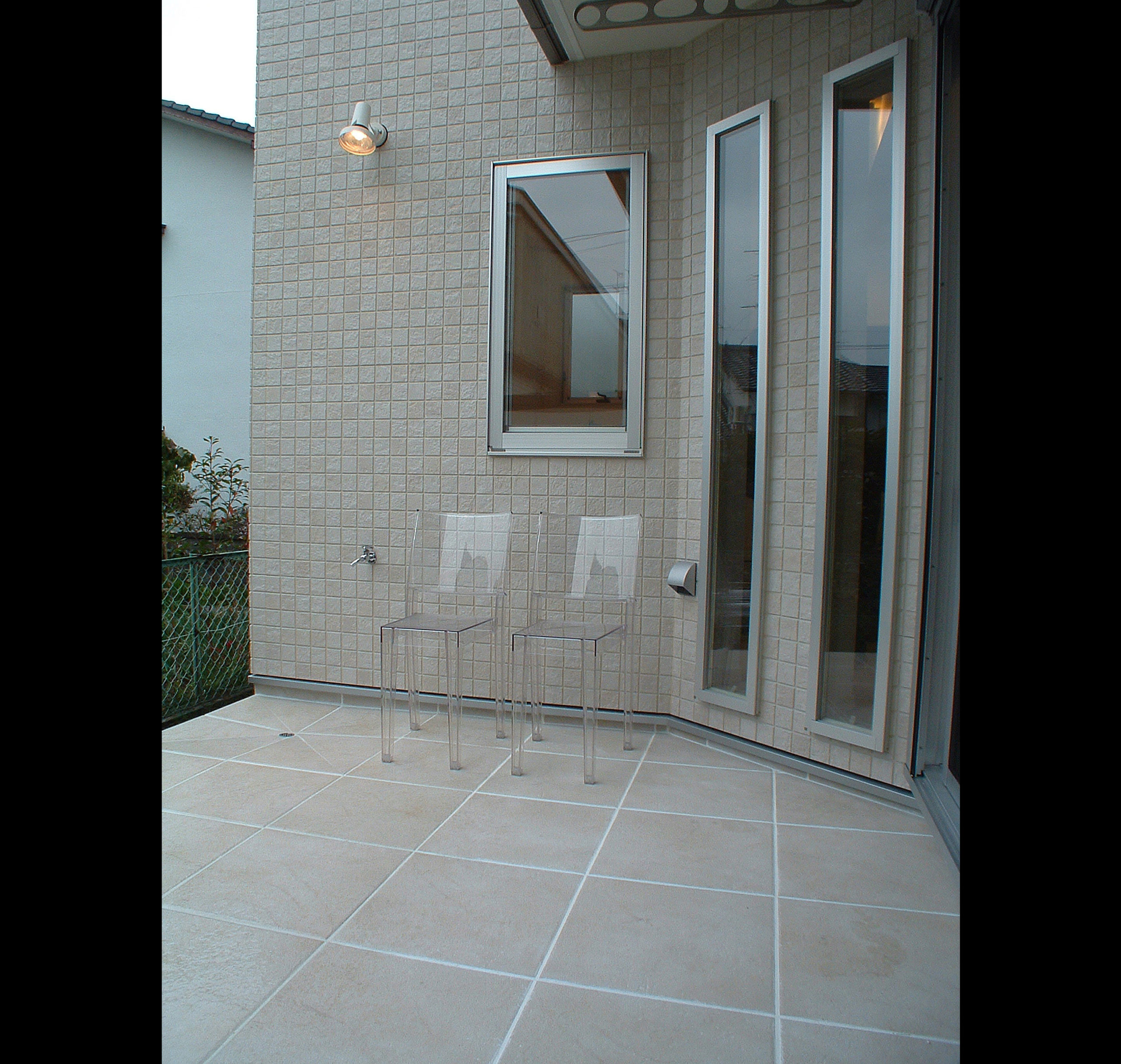 ダイニングキッチンを一番気持ちの良い東南の角の小庭に面させ、テラスを設け隣家の視線を遮る壁や植栽で癒しの空間を計画。