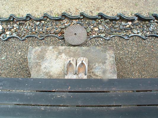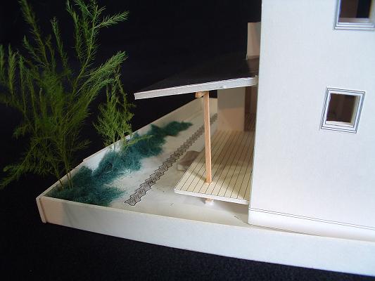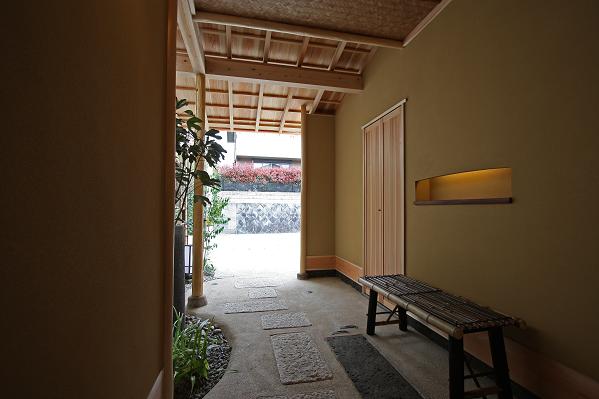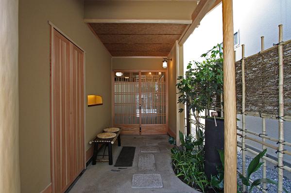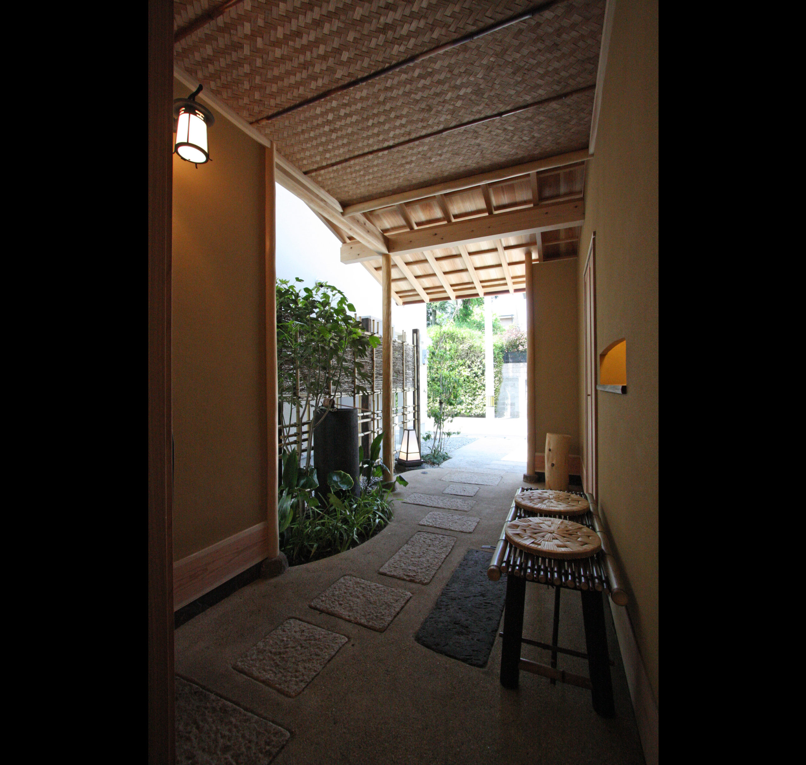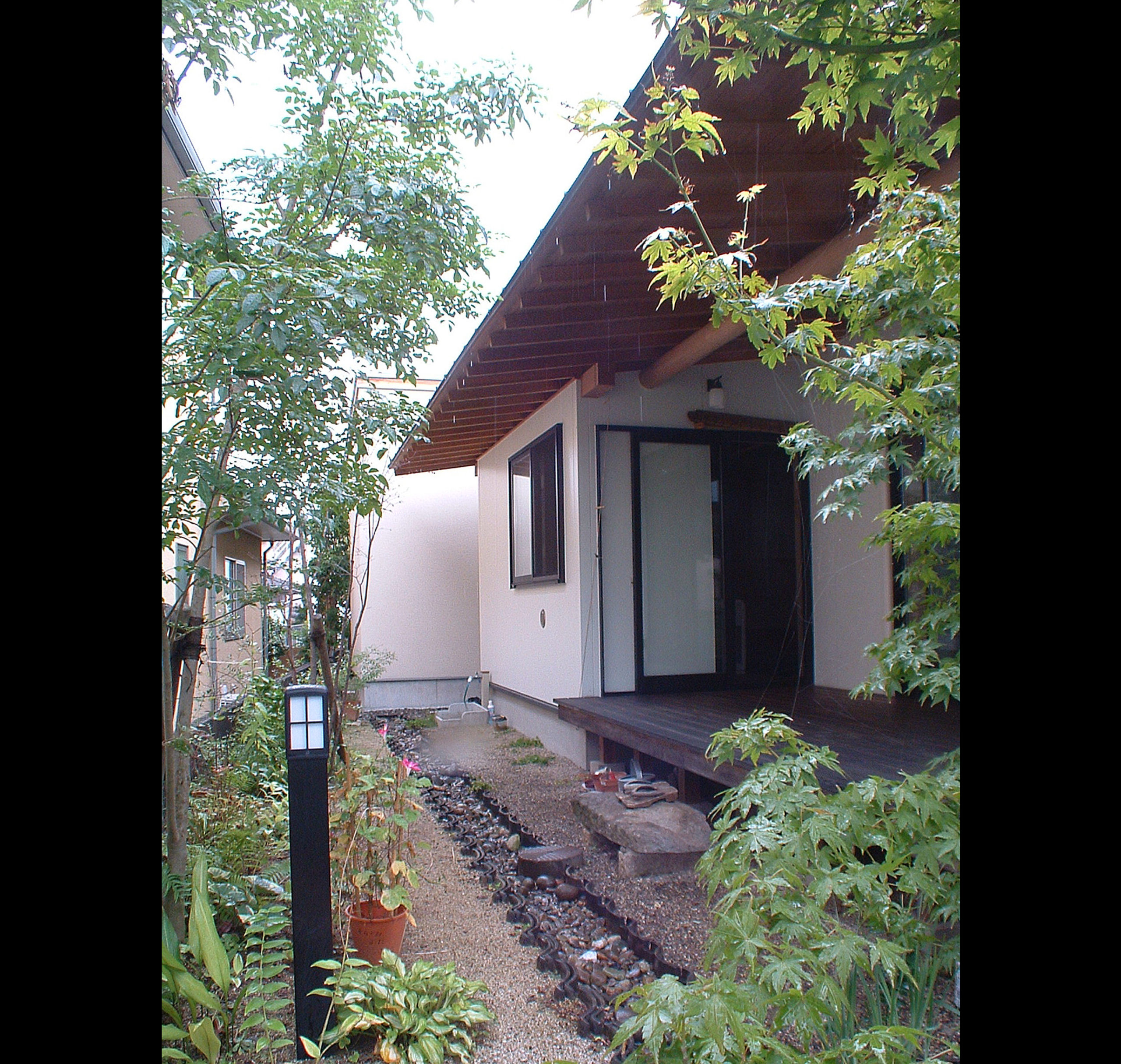 東西方向が短いが、南北方向に長いところを利用し、アプローチを長くとりその部分には低い屋根をかけて外の土間とし、植裁や砂利を敷き、観賞する腰掛けを置いた。