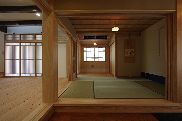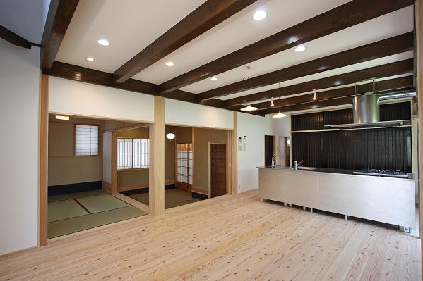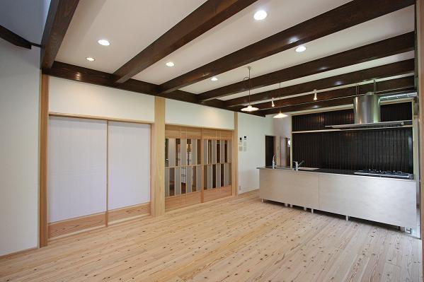 土間6帖、和室6帖、DK20帖は桧7寸の大黒柱を中心に、用途に合わせ各部屋を引き戸で仕切ることもできるし開け放して使用することもできる。