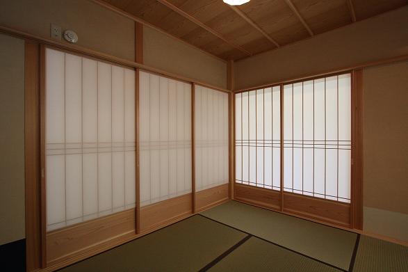 濡れ縁には下屋を設け、この下屋付きの濡れ縁は庭と室内を結ぶ中間領域で、外部空間なのか、内部空間なのか判然としないところが良いところである。
