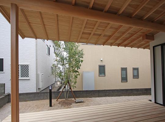 3台分の駐車スペースと建物を除いて15帖ほどの庭を造り、ダイニングや和室に続けて濡れ縁を設けた。
