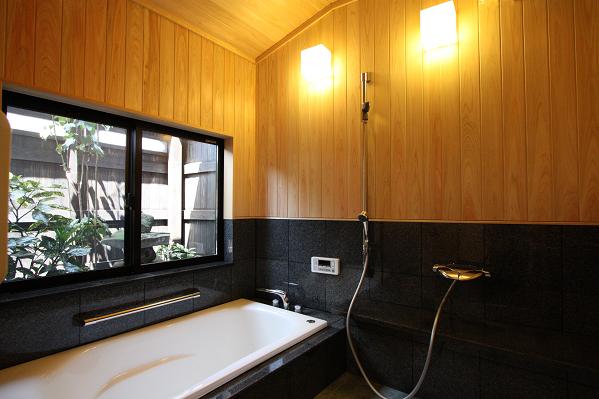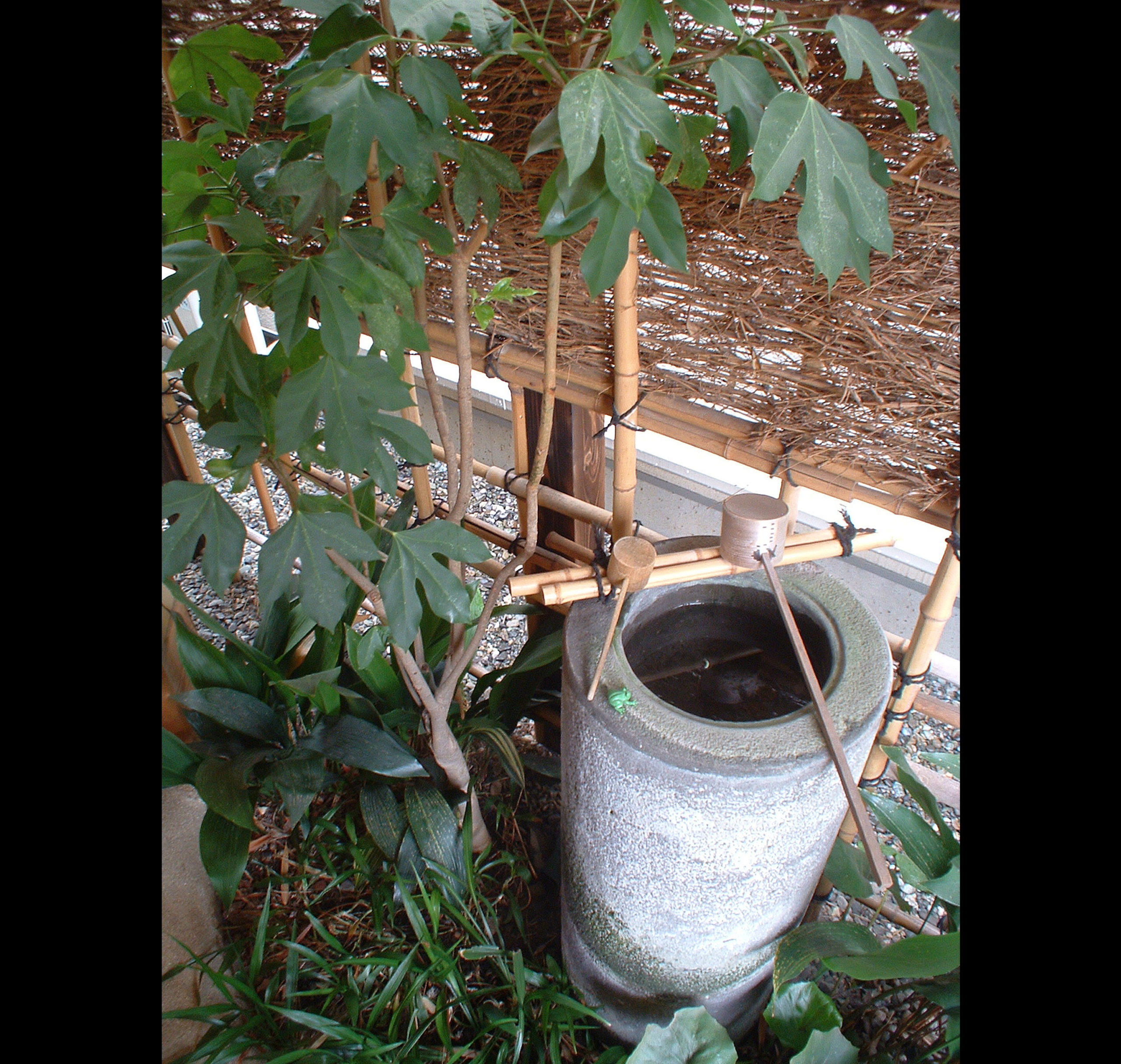 濡れ縁の下屋の軒先には、わざと樋を付けず雨の日には軒先から雨落ち溝に雨が落ちる様子を眺めるのも風流で心を休めることができる。