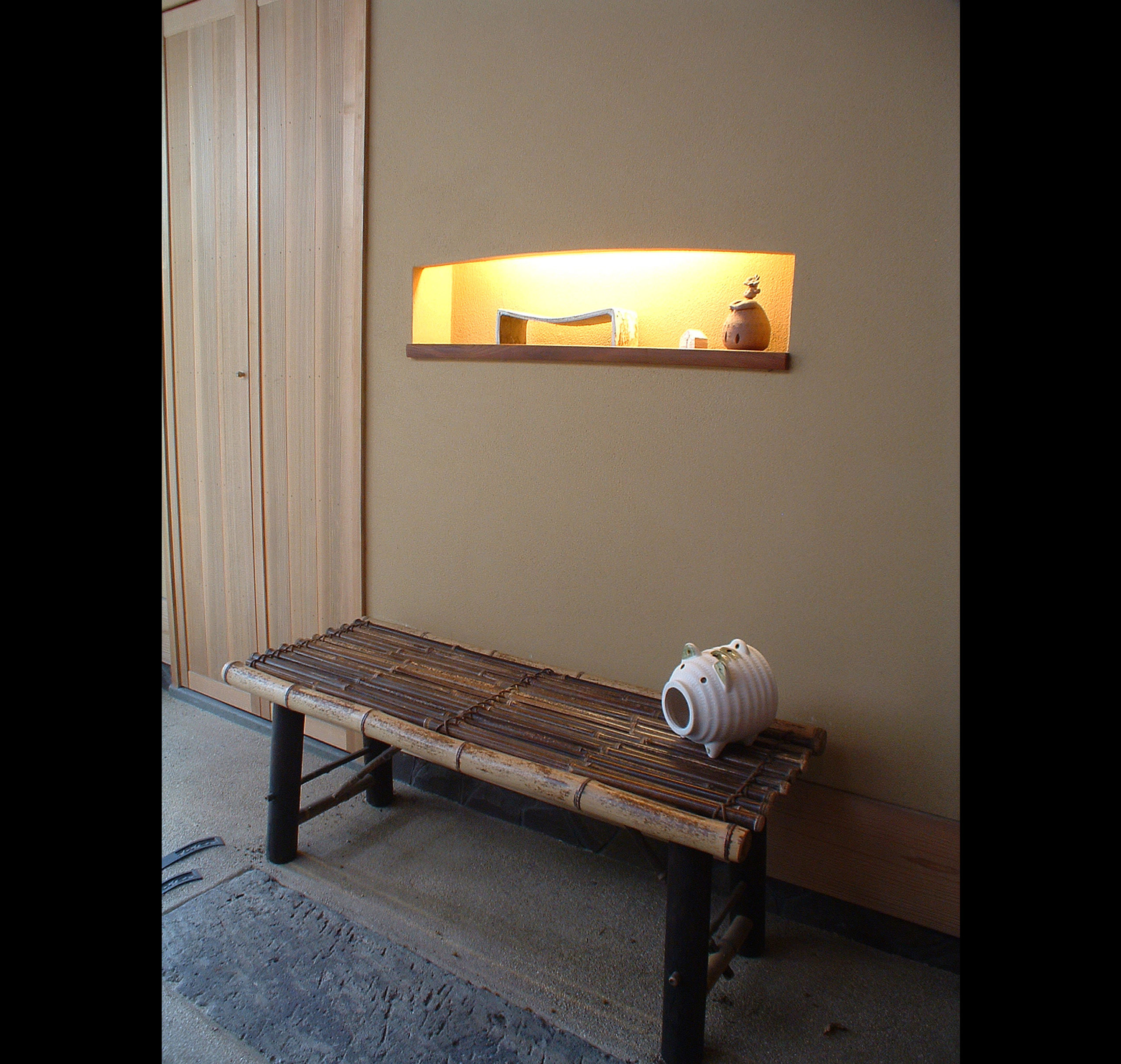この腰掛けは、玄関の戸を開ける時、手荷物を置く場合などにも便利である。