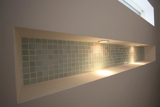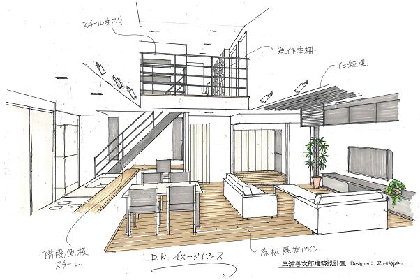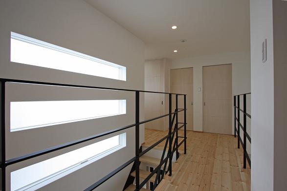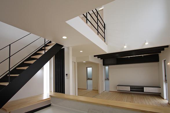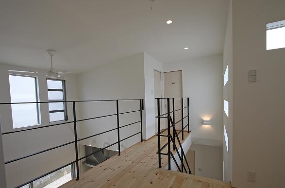 さらに階段上部の吹抜をLDK上部の吹抜と連続させ2階の廊下をブリッジ状にすることでLDKと2階ホールの開放感を出した。