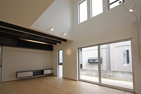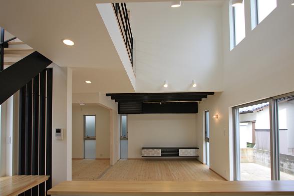 敷地の南側には3階建ての住宅があるため、LDKの一部に吹抜を設け高窓から光を取り入れ1Fと2Fの連続性を高め開放感を出した。