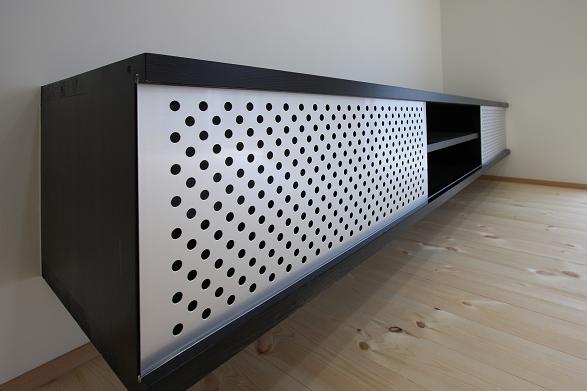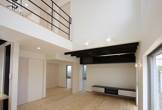 建具は木目が分かる白の塗料で塗り、化粧梁や階段の桁、手すり、面格子、TVカウンターを黒で塗り白い壁とのコントラストを出して空間を引き締めた。