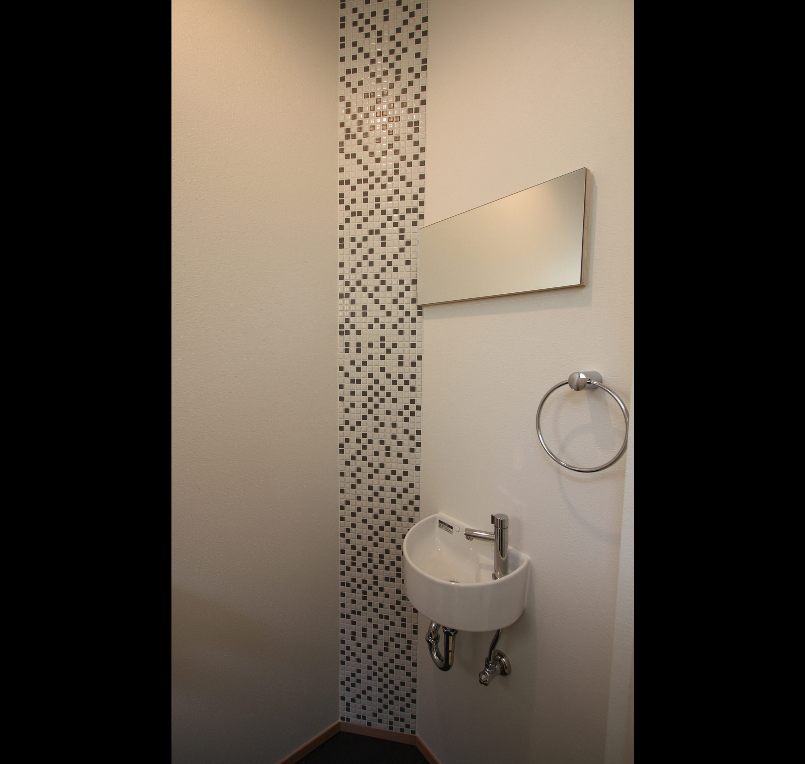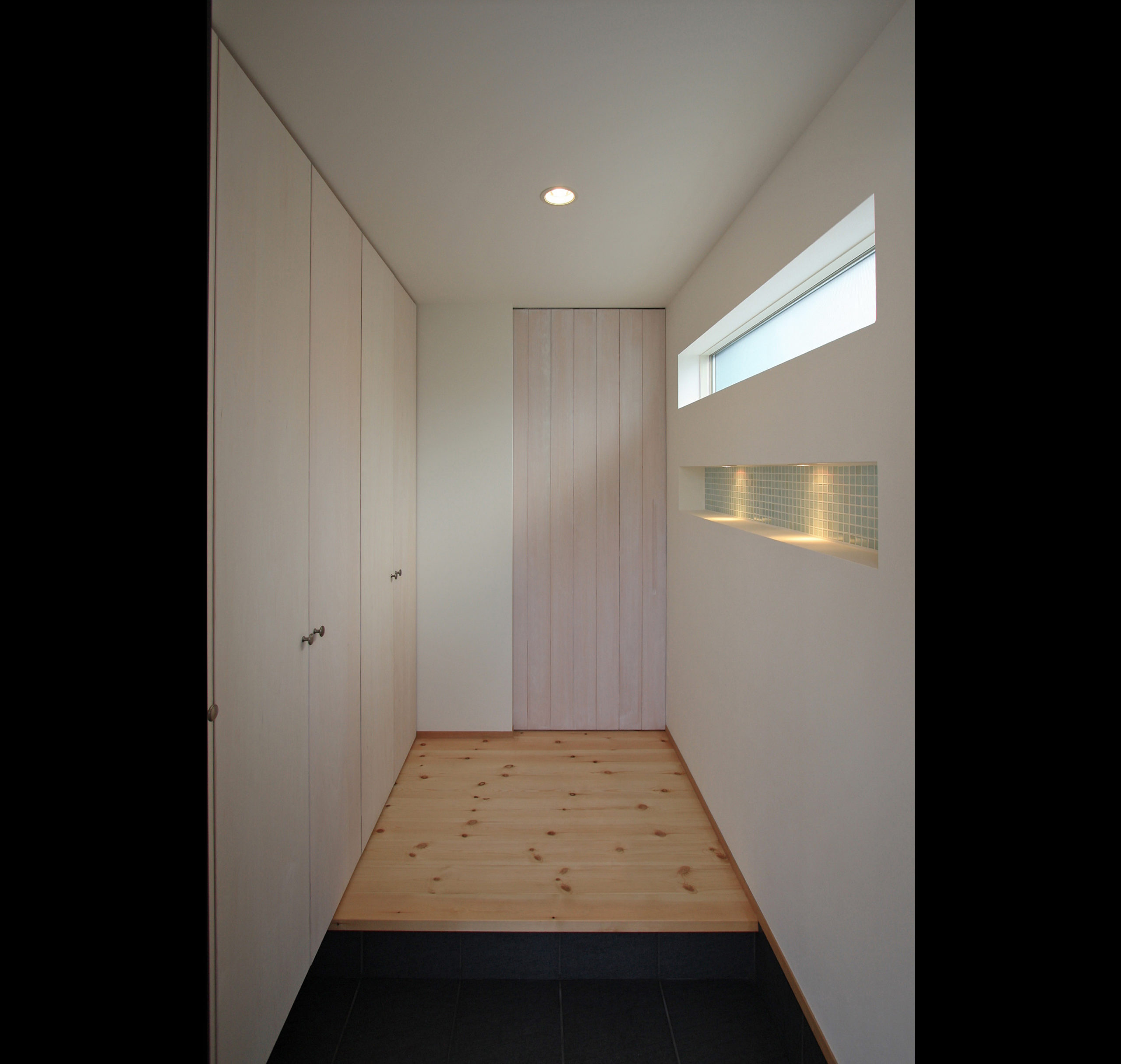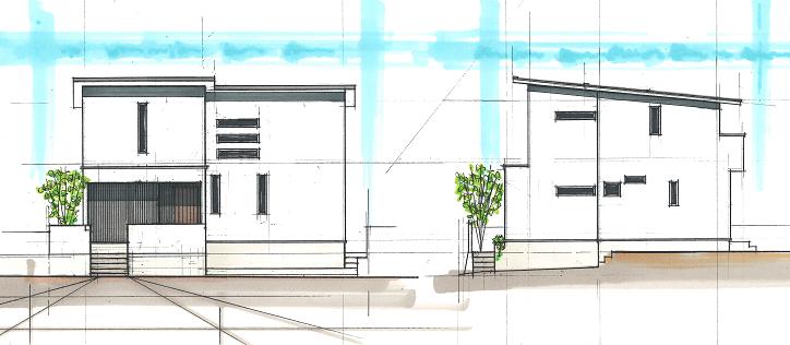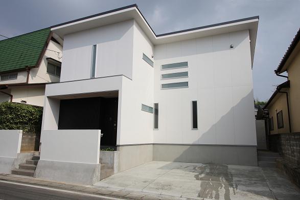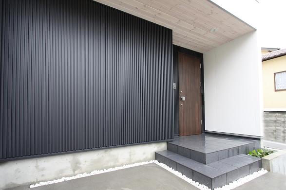 この家のテーマは 「シンプル」 である。外観はL型の総2階建てに片流れの屋根でシャープさをだし玄関部分は白い壁に黒のガルバリウム鋼板を貼りシンプルに仕上げた。