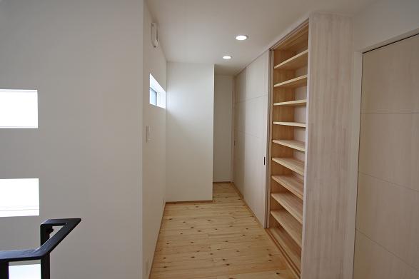 2階のホールにはご主人の書斎コーナーを設け、単行本2000冊を収納できる造作本棚を備えた。
