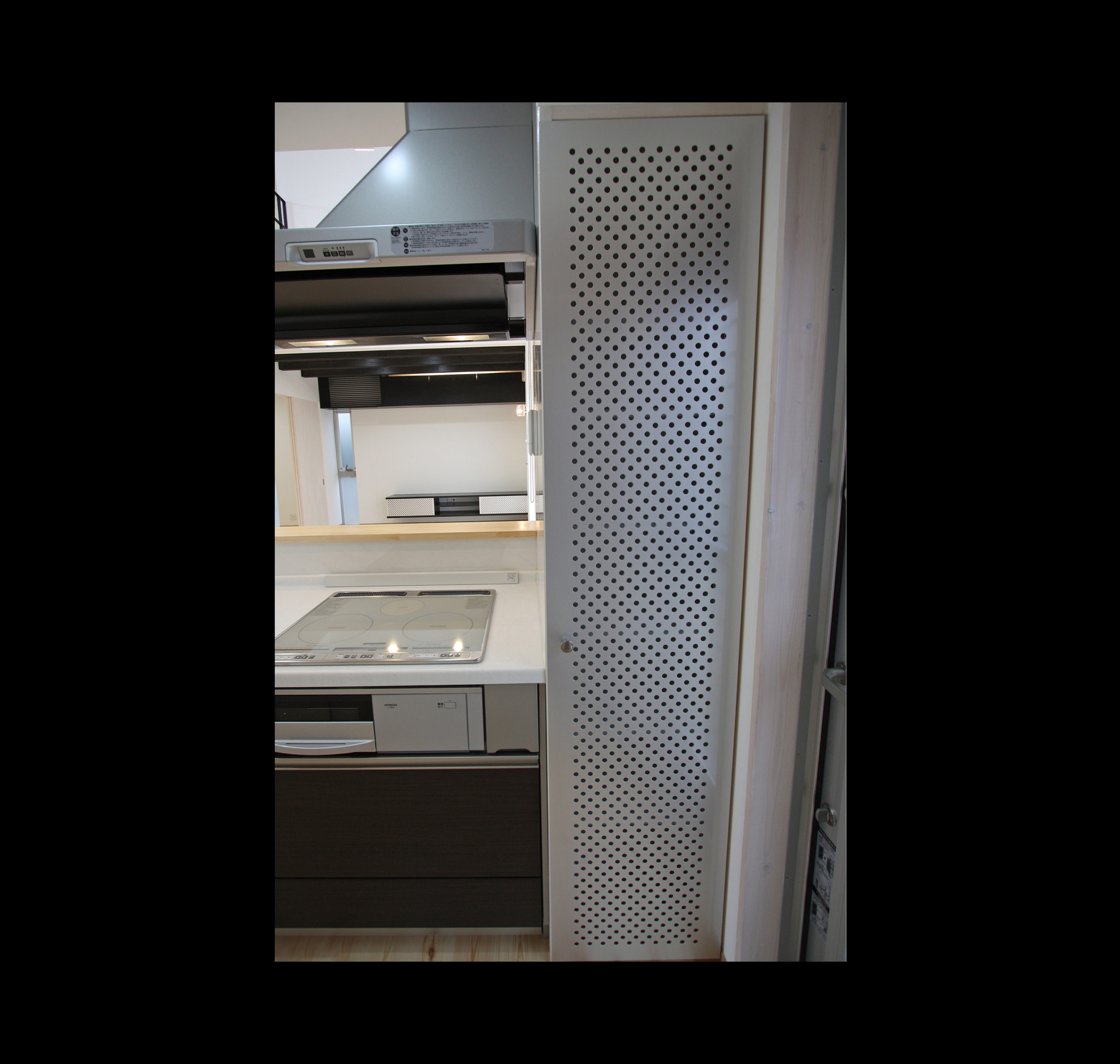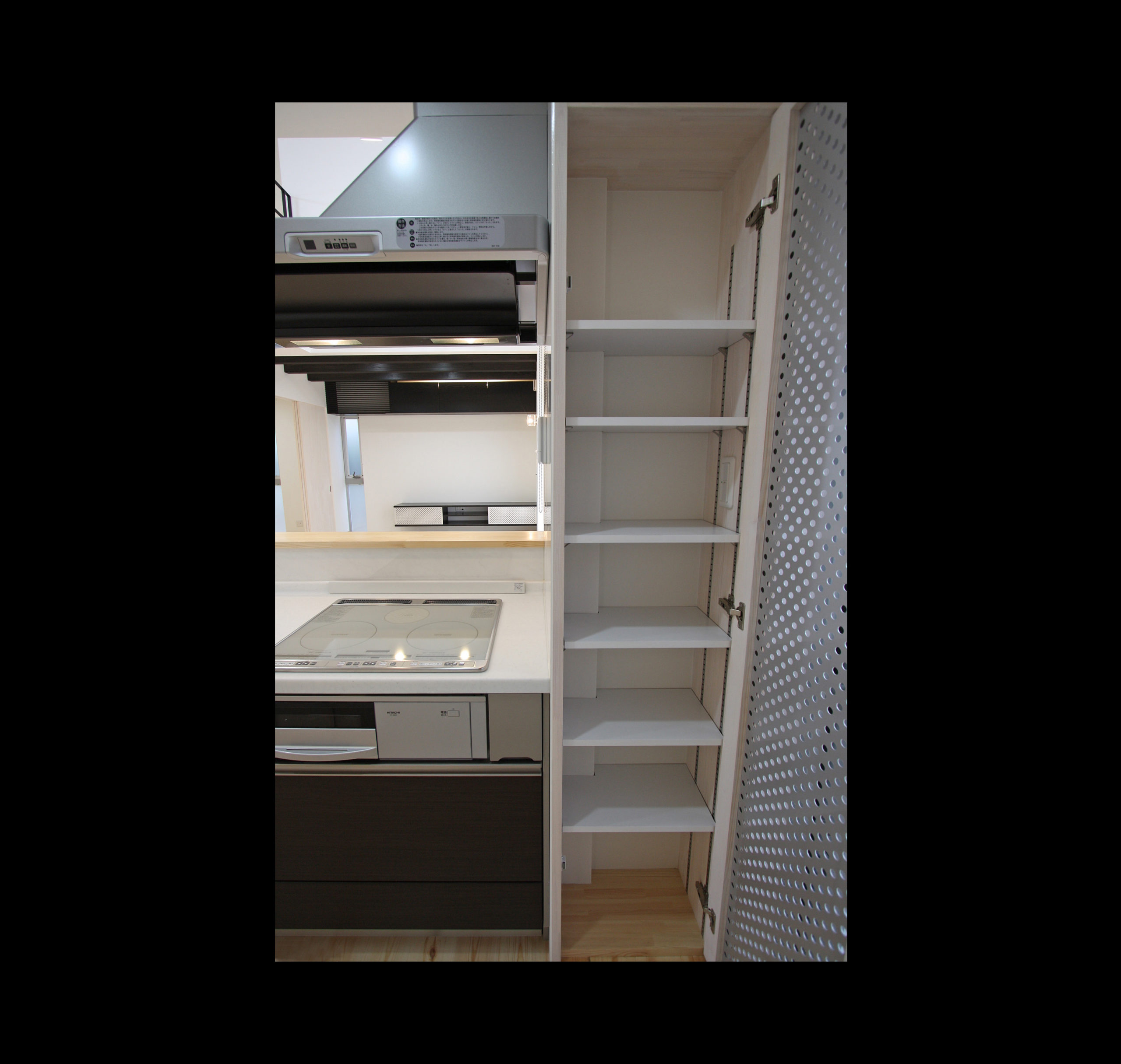 LDKは階段を含め21帖であるが階段の桁を厚さ10mmのスチール製とし、視線が抜けるようにストリップ階段にすることで圧迫感を減らしシンプルさをだした。