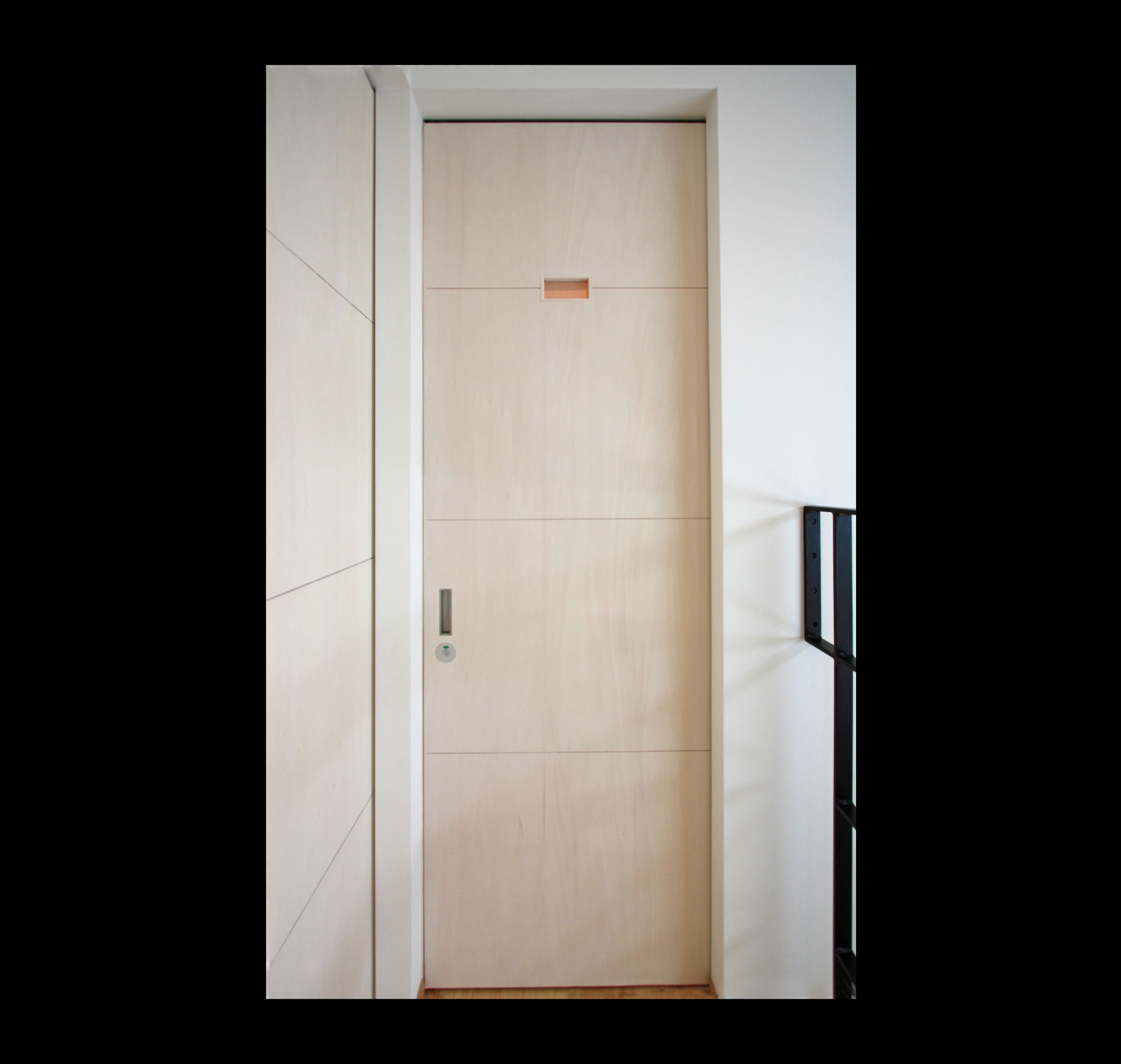 内部もシンプルさを出すために窓や建具の木枠や見切り材を極力無くし、階段の段板を支える桁や手すりをスチール製にしてスッキリと納めた。