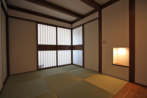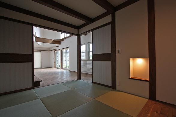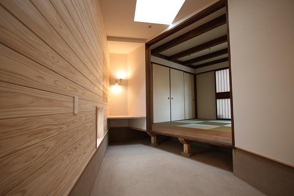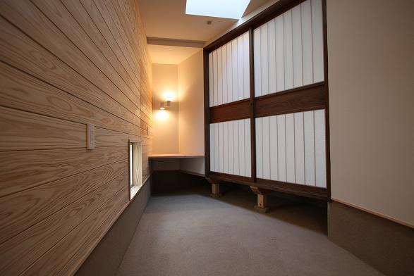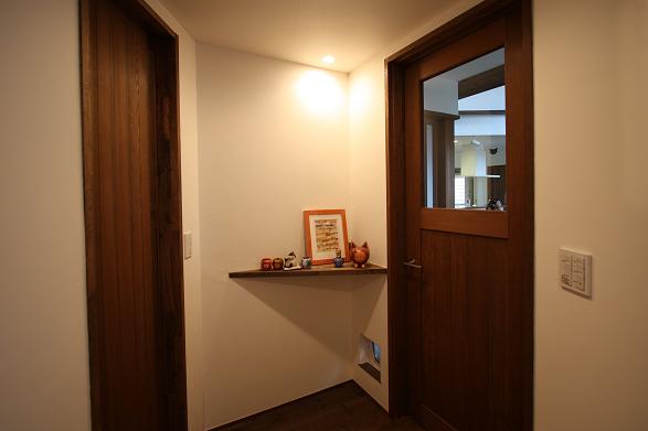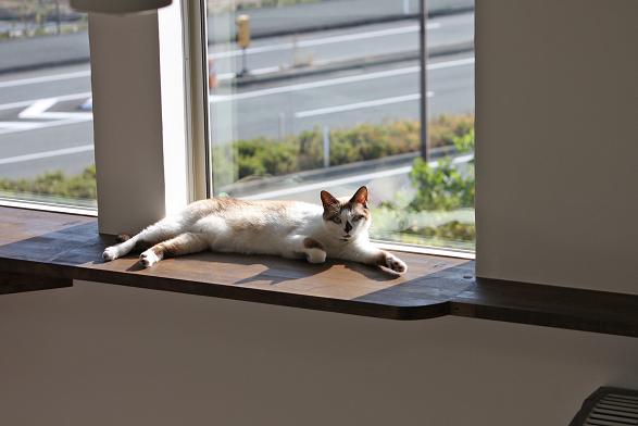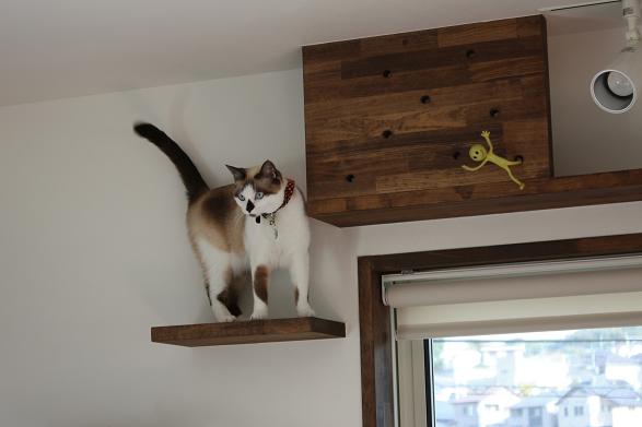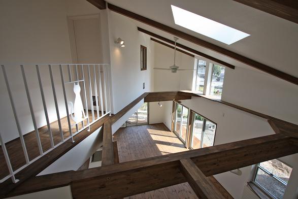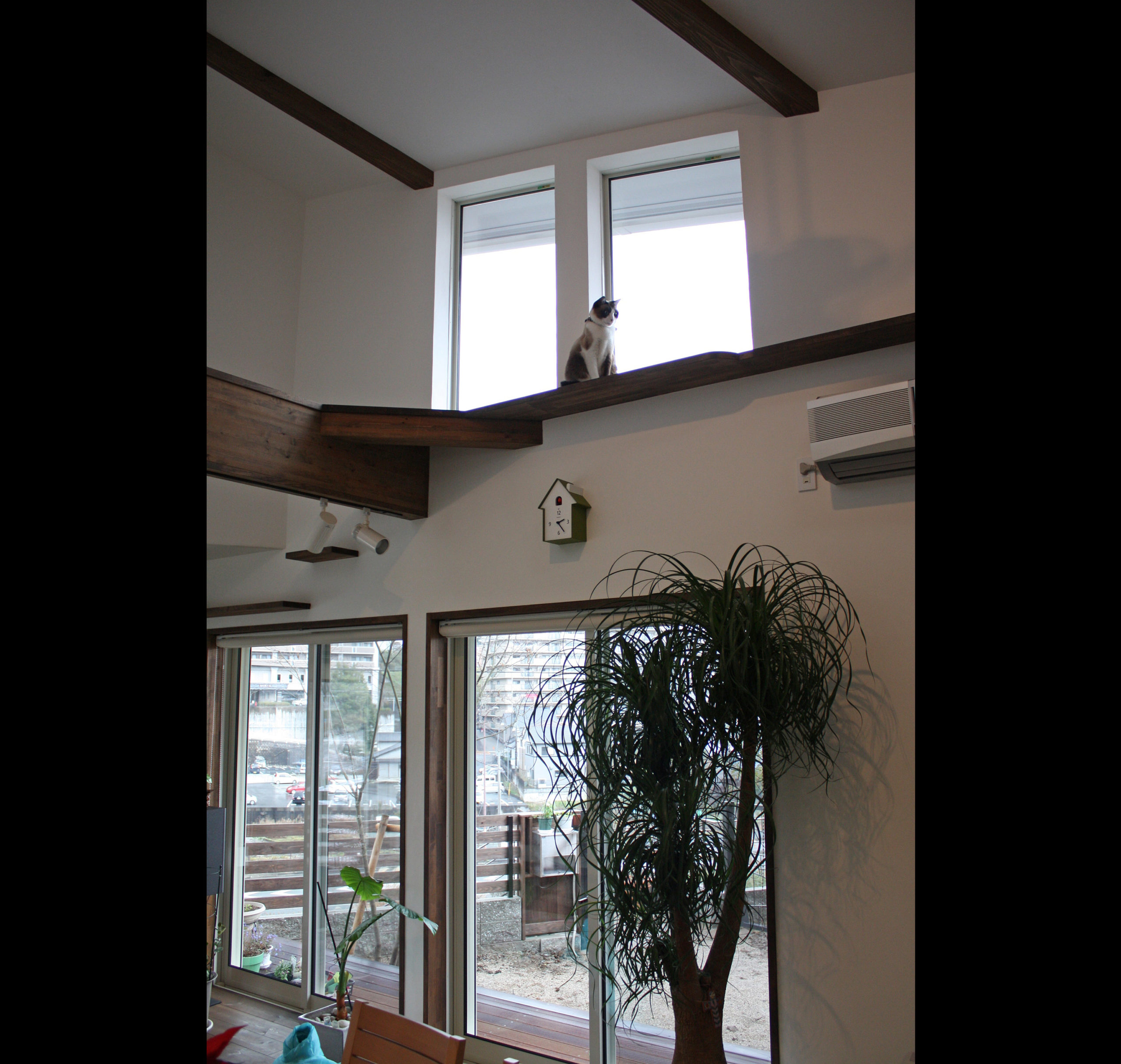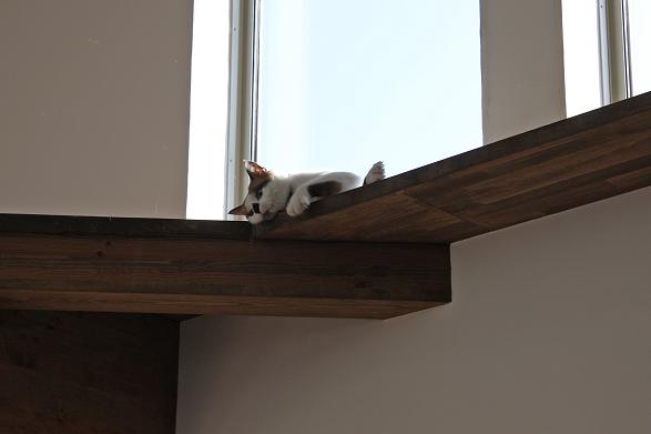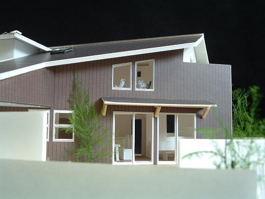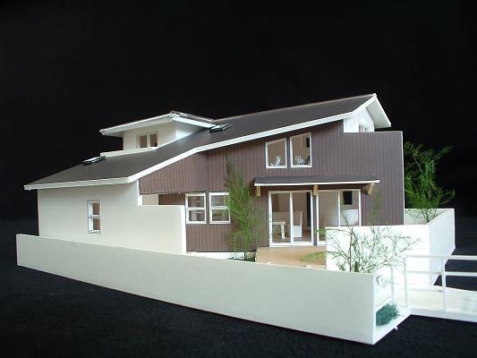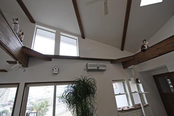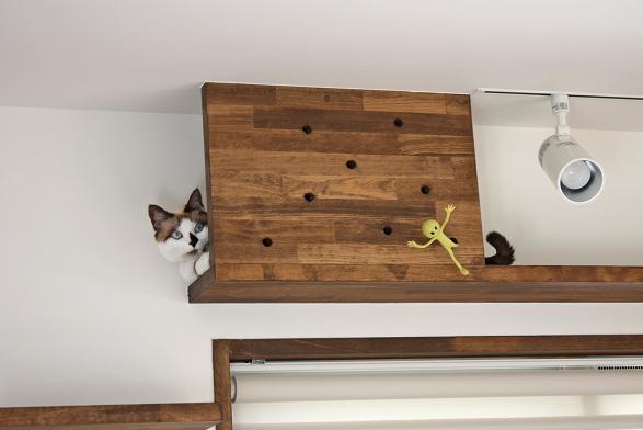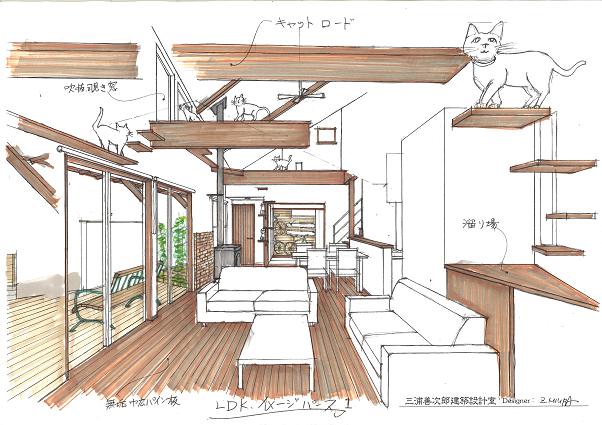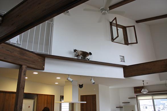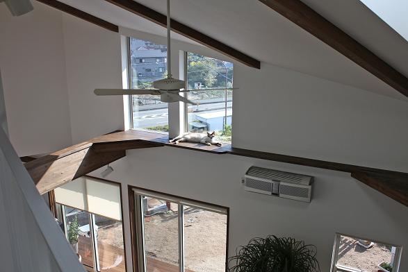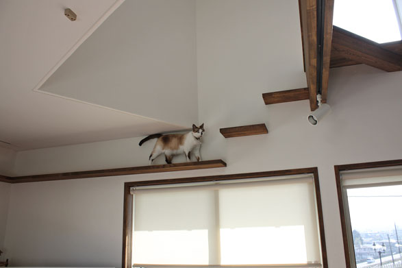 敷地は南向きで東西方向に長く南北方向(11m)に短い。 敷地は高台にあり雨上がりなどの空気が澄んだ日には遠くに山々が見え眺望が良い。 設計当時南側には2階建ての住宅は建っていなかったが2階建ての住宅が建つことを想定。 南北方向が短いのでそのまま建ててしまえば南側の家の壁が見えるだけである。 LDKを一番眺望の良い方向に斜に振って配置した。 LDKと上部の吹抜を斜に振ったが、2階の部屋は日当たりのことを考えて南側に向けた。 LDKと吹抜を斜に振ることにより建物の外観や吹抜が異形となりその変化を楽しめた。 吹抜が異形となったので2階の床の剛性を高めた。 ご主人の趣味室を玄関から土間続きで設け、和室と続けることでゴロンと寝ころび休憩することもできる。 この家の一番のテーマは猫が楽しく遊べる家である。 リビングのソファーの後ろの溜まり場から猫用の階段を上り、吹抜のキャットロードを歩いて見晴らし台や溜まり場、各部屋を行き来できる仕掛けになっている。 キャットウォークではなく家中を駆け巡れるのでキャットロードと名付けた。 猫が見晴らし台で日なたぼっこをしてくつろぐ姿を見て安心した。 当初は薪ストーブの設置をご希望だったが、近隣が接近しており煙による苦情等の事を考え放射暖房システム に変更された。 放射暖房システムとは、熱源から送られる温水によって ヒータの表面にやわらかな熱が生まれ放射とともに壁や床を暖め建物全体を快適な温度に保ち、ファンの音もなく 無風のためホコリも立たないシステムである。 森の中にいるような感じがお好きと言うことで沢山の木々を植栽され枕木は施主自ら立てられた。
