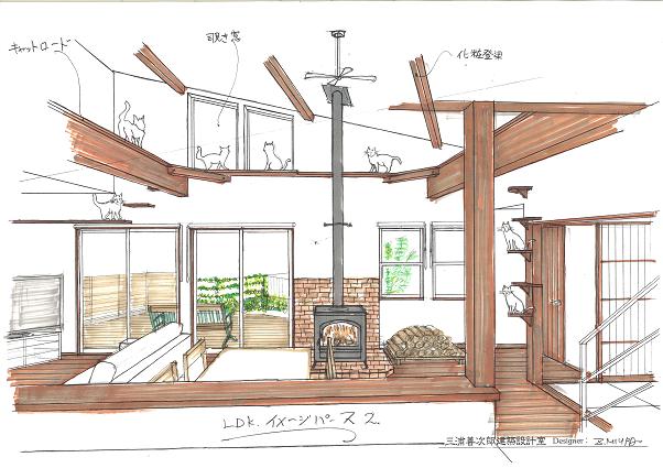 施主要望 猫が遊べる家 眺望の良さを 活かしたい 適度にモダンで 古びた感じ 経年美 外壁に板を貼りたい 吹抜に梁を見せ キャットウォ-クする 薪ストーブ 趣味の部屋 植栽して緑を楽しむ