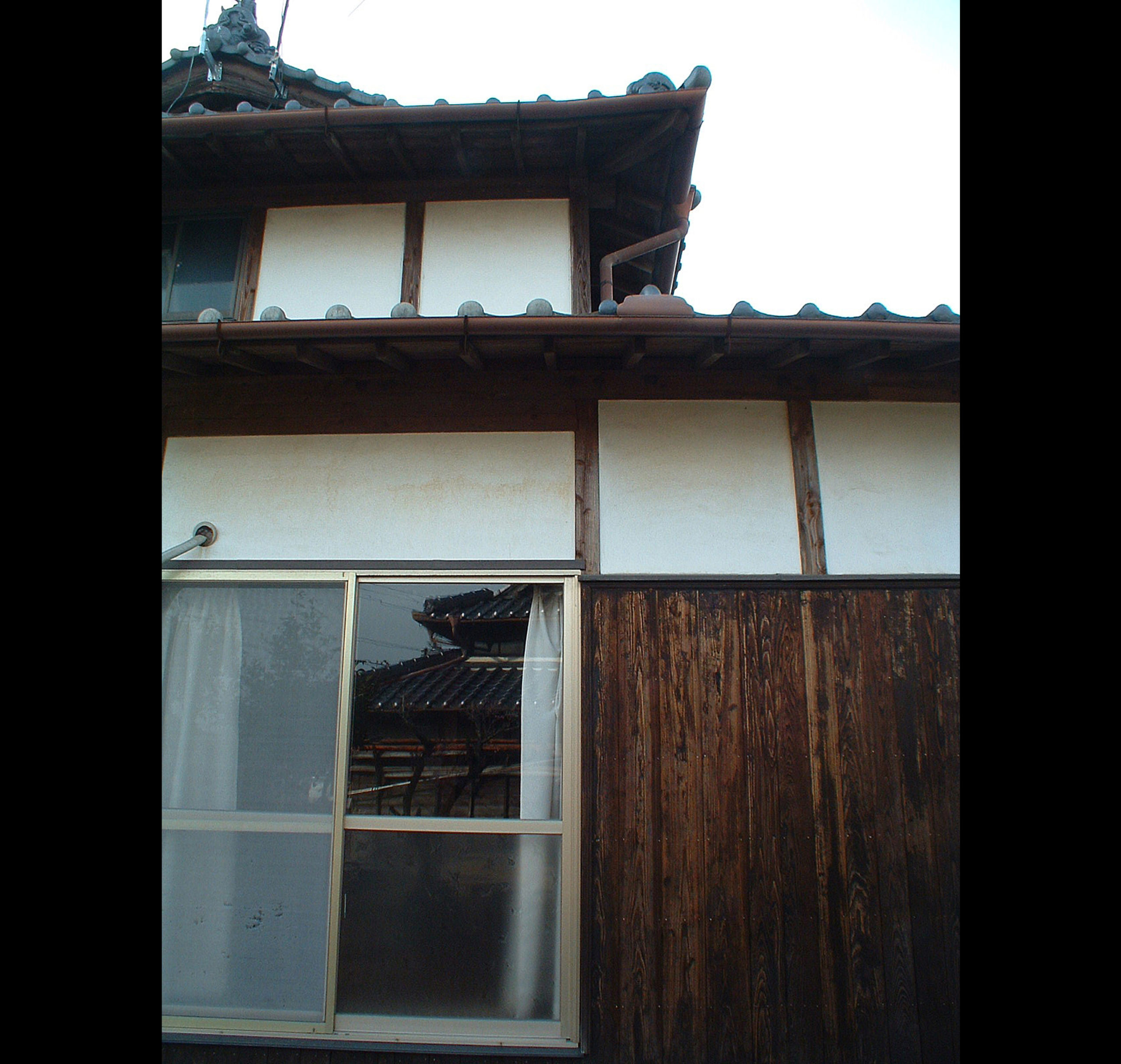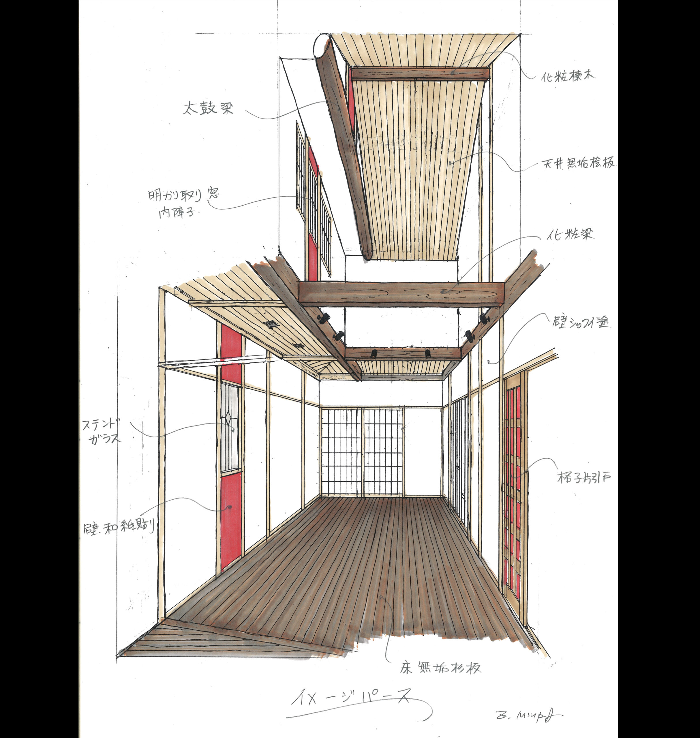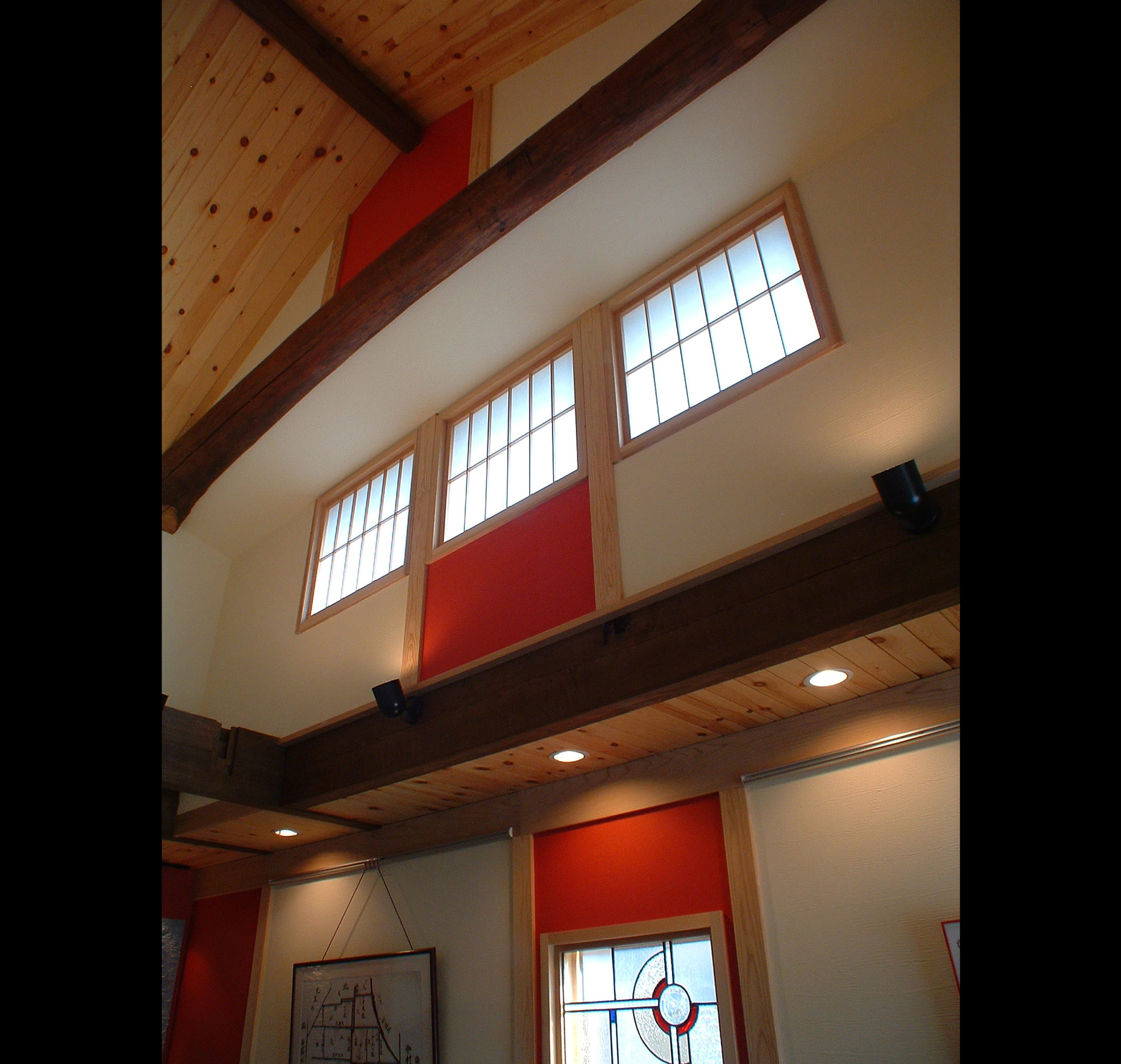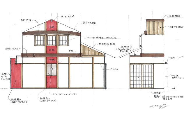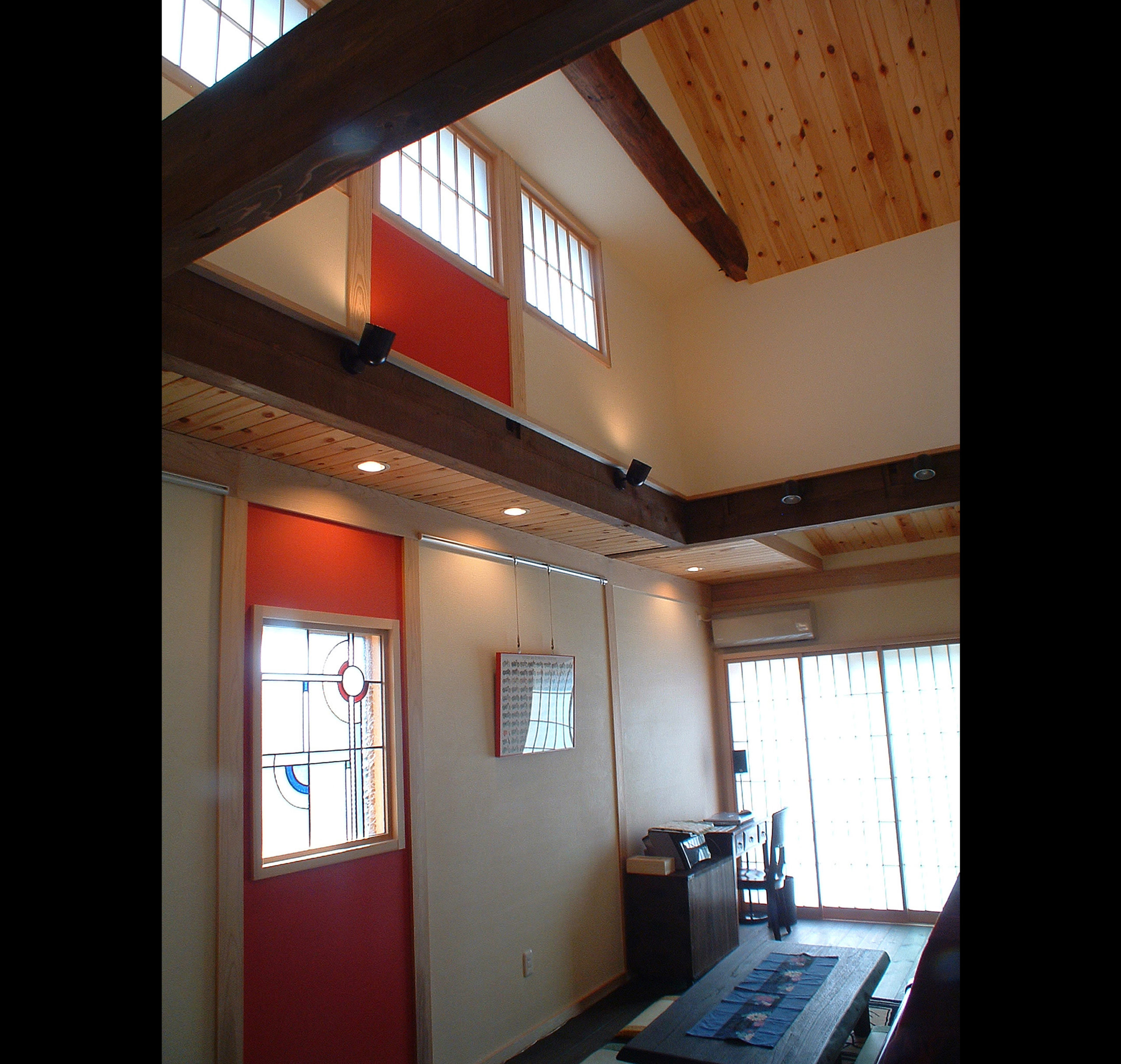 箕甲(みのこ)造りの屋根を持つ和風の家の部分的なリノベーションである。 あまり使われていない窓を取り外し、壁を増やし外観内観共にシンプルでスッキリしたデザインに変更した。 6帖二間の間仕切り壁を無くし12帖にし、小屋裏の物置を無くし吹抜にして吹抜の壁に窓を取付け光を取り入れ明るく開放的にした。 既存の小屋裏の太鼓梁を現し、コストが上がらない方法で小屋梁や小屋束を整理しシンプルでスッキリしたデザインに変更した。 施主のイメージカラーの朱色を室内の壁に取り入れデザインのポイントをとった。 朝日が射し込み採光を楽しめるようステンドガラスを使用した。 キッチンの収納は壁に埋め込みスッキリさせた。