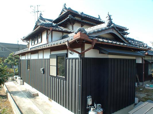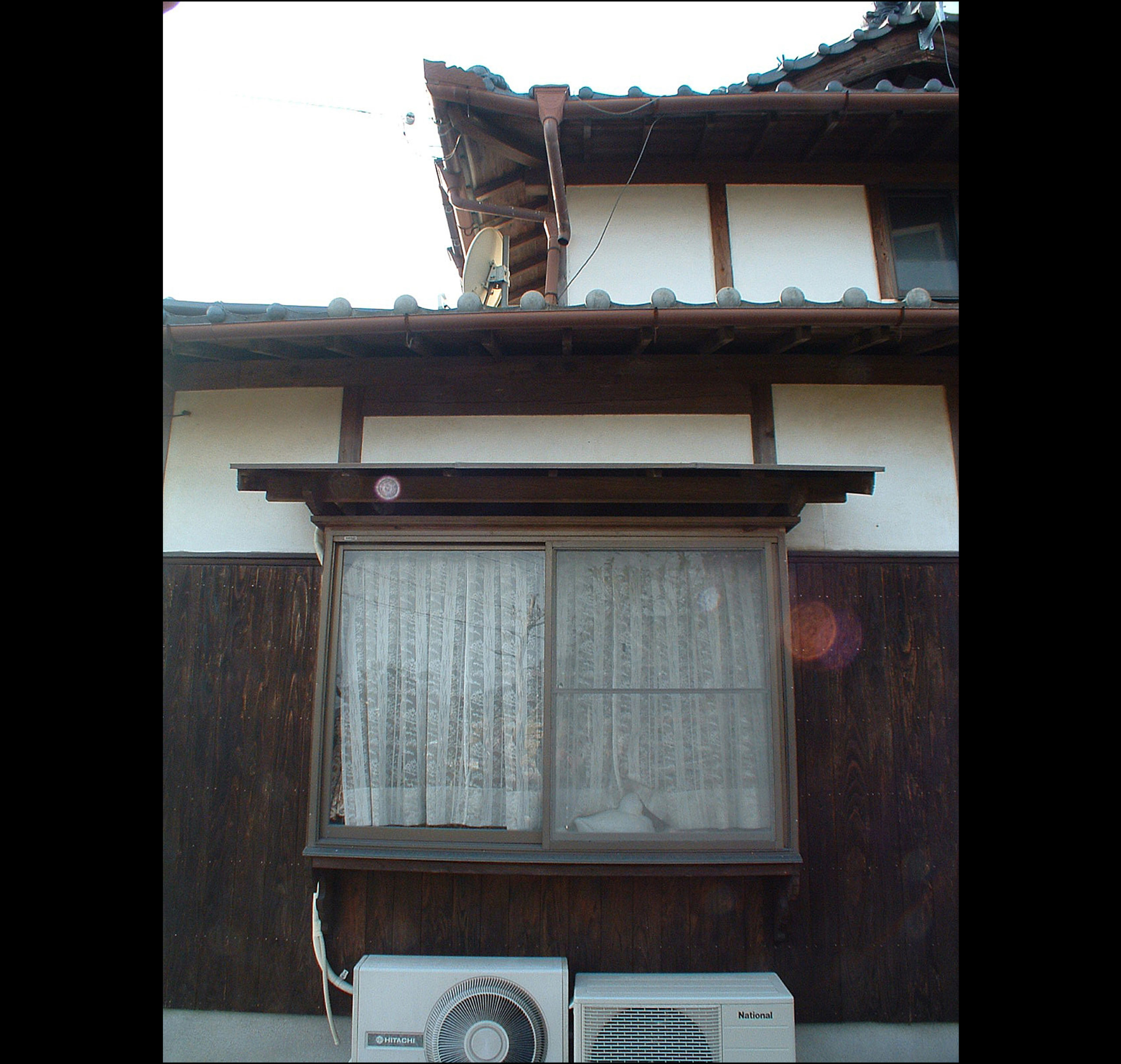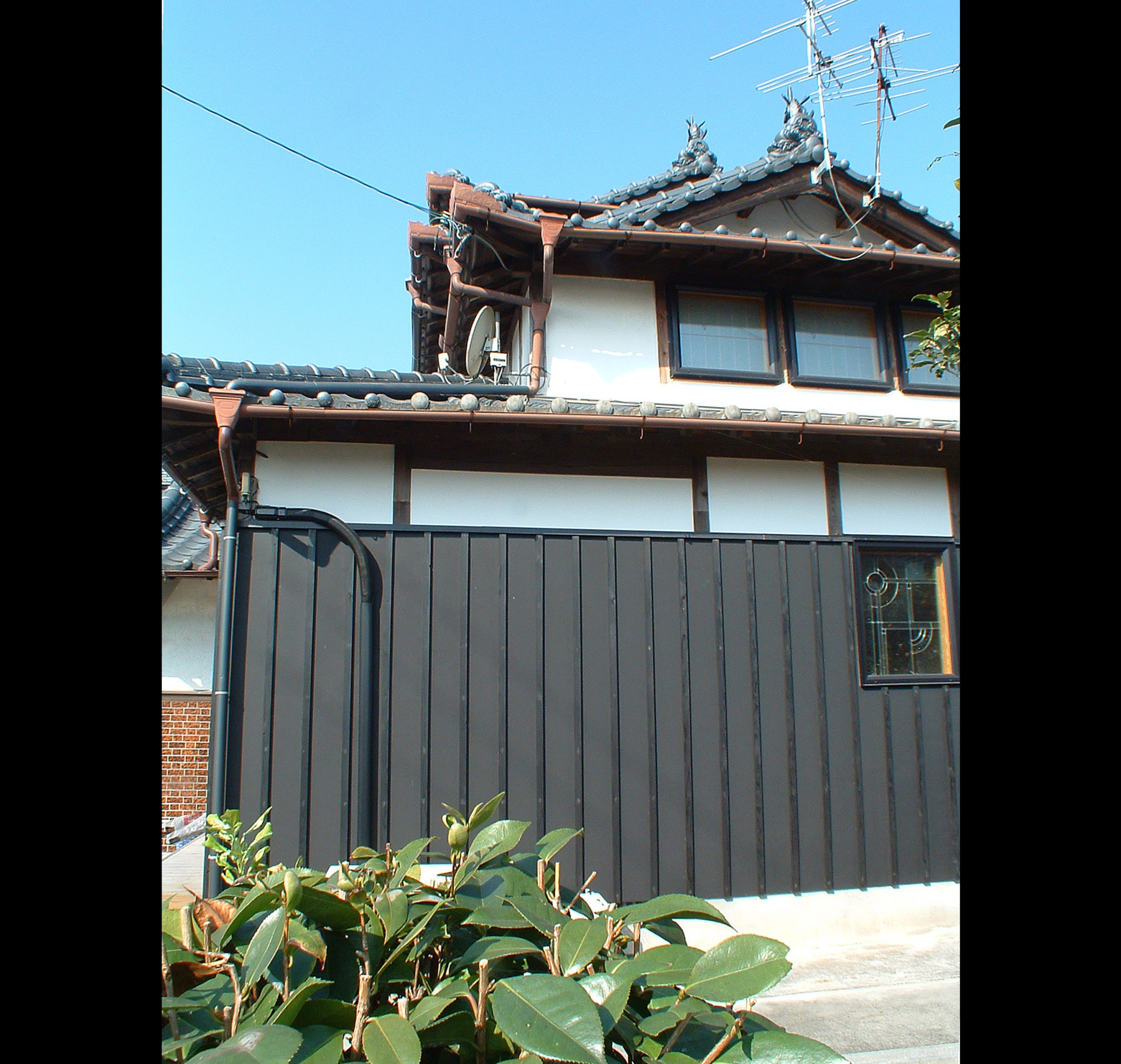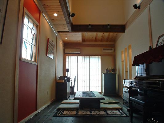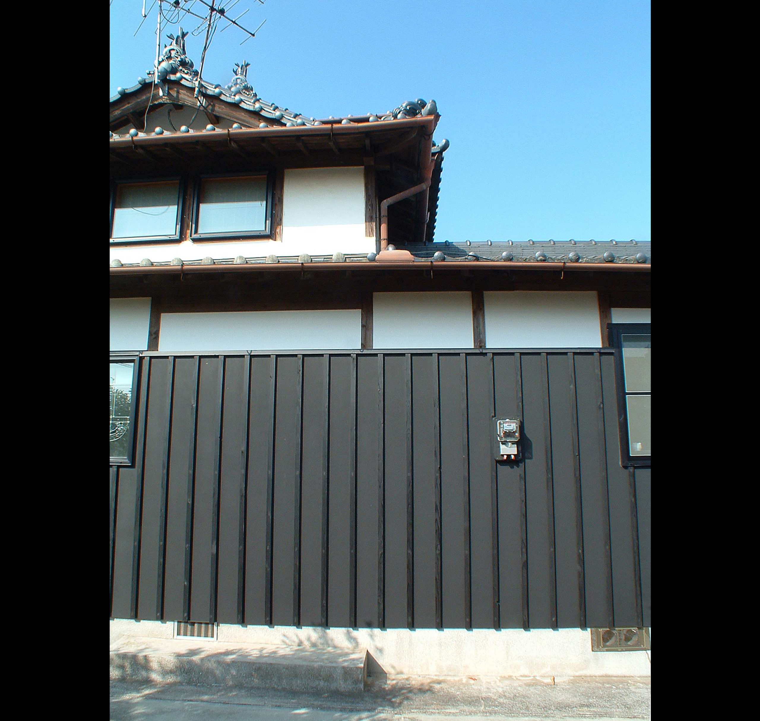 箕甲(みのこ)造りの屋根を持つ和風の家の部分的なリノベーションである。 あまり使われていない窓を取り外し、壁を増やし外観内観共にシンプルでスッキリしたデザインに変更した。 6帖二間の間仕切り壁を無くし12帖にし、小屋裏の物置を無くし吹抜にして吹抜の壁に窓を取付け光を取り入れ明るく開放的にした。 既存の小屋裏の太鼓梁を現し、コストが上がらない方法で小屋梁や小屋束を整理しシンプルでスッキリしたデザインに変更した。 施主のイメージカラーの朱色を室内の壁に取り入れデザインのポイントをとった。 朝日が射し込み採光を楽しめるようステンドガラスを使用した。 キッチンの収納は壁に埋め込みスッキリさせた。