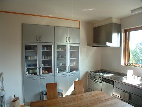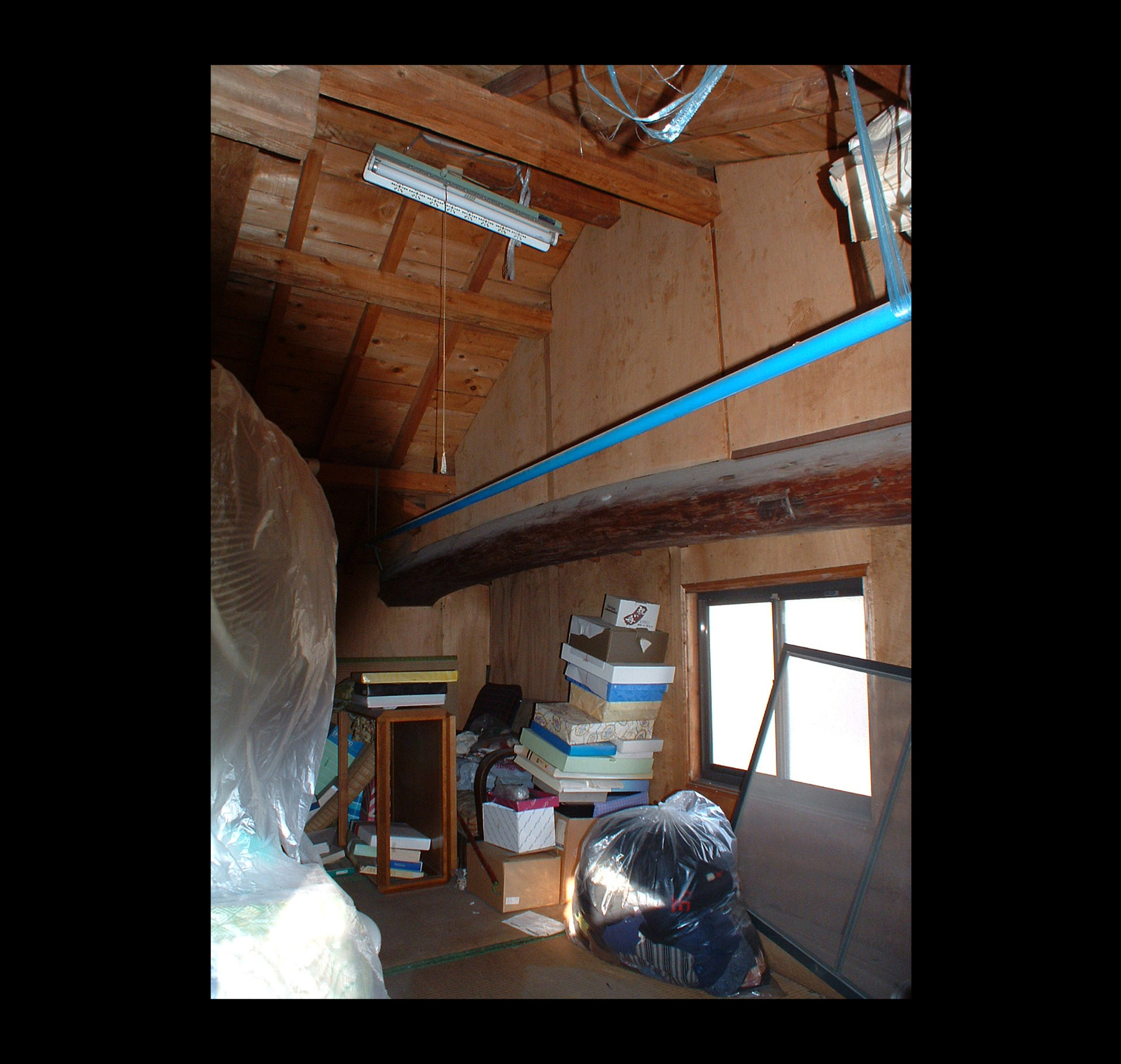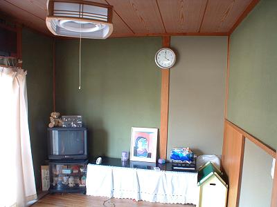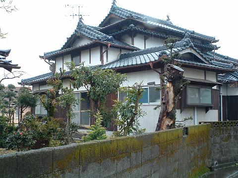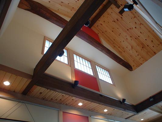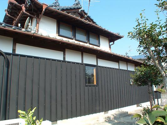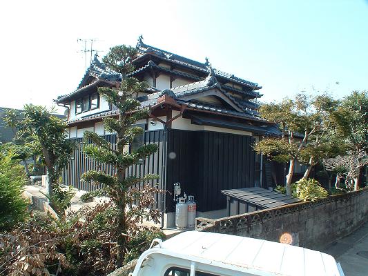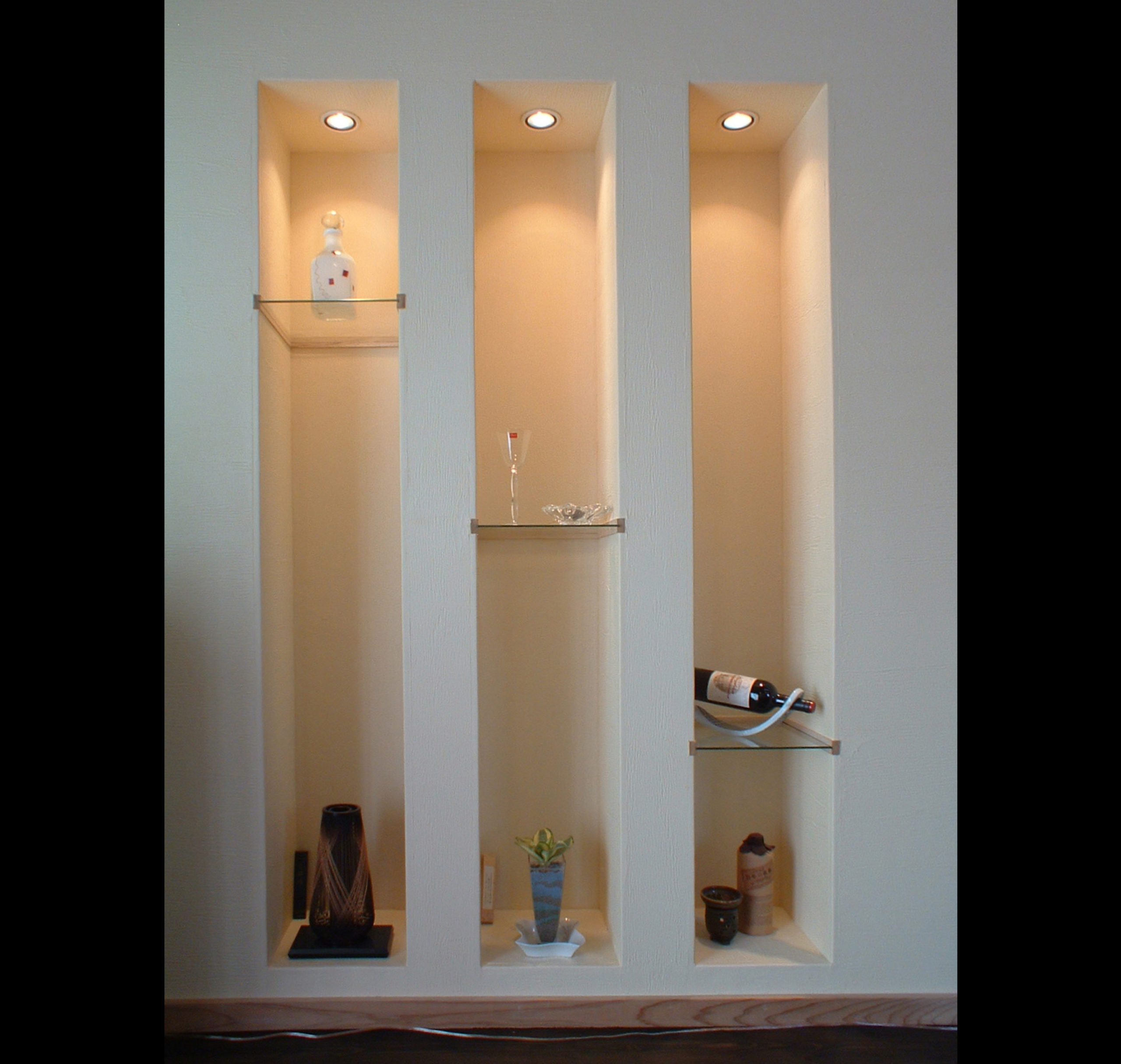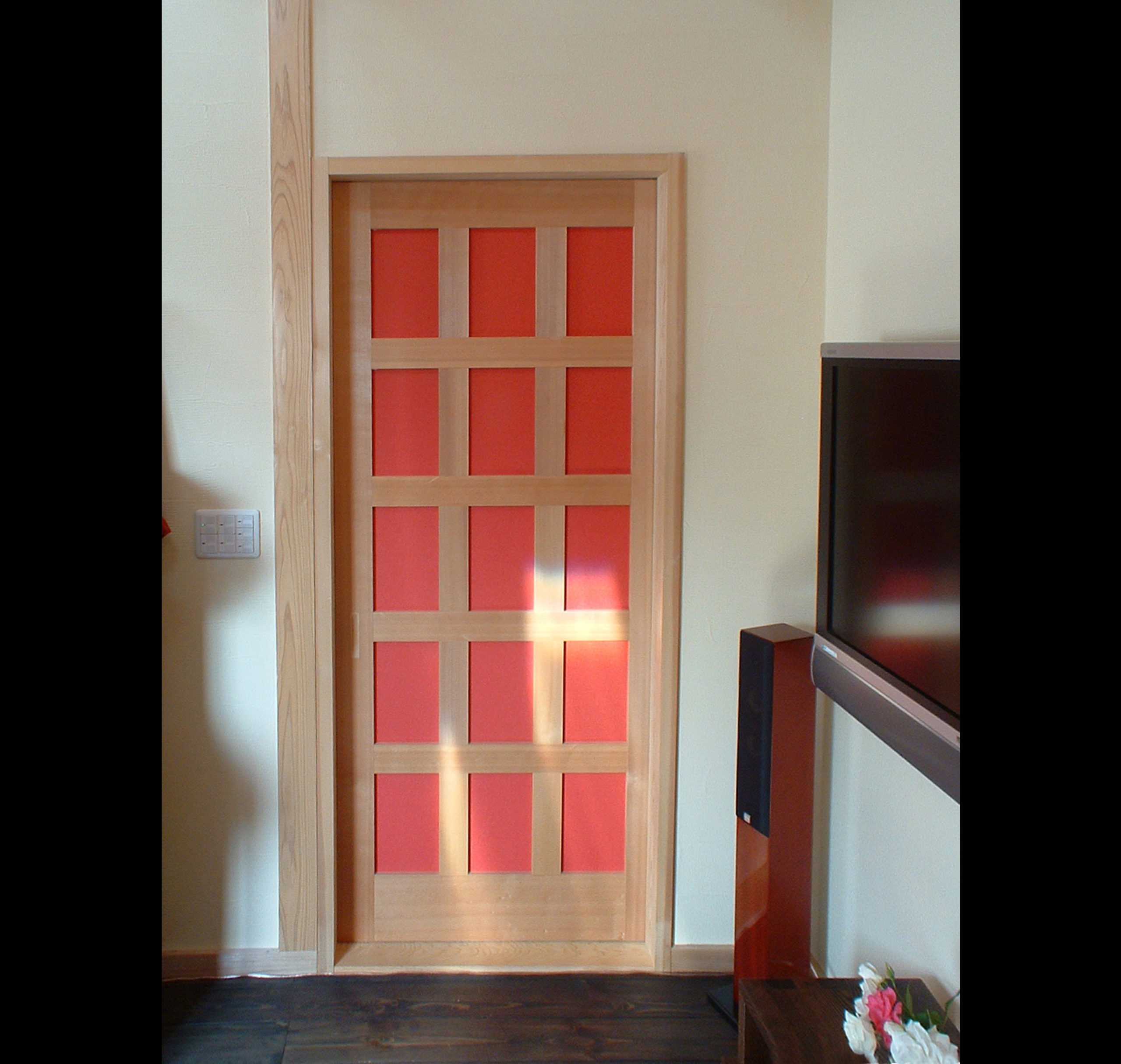 箕甲(みのこ)造りの屋根を持つ和風の家の部分的なリノベーションである。 あまり使われていない窓を取り外し、壁を増やし外観内観共にシンプルでスッキリしたデザインに変更した。 6帖二間の間仕切り壁を無くし12帖にし、小屋裏の物置を無くし吹抜にして吹抜の壁に窓を取付け光を取り入れ明るく開放的にした。 既存の小屋裏の太鼓梁を現し、コストが上がらない方法で小屋梁や小屋束を整理しシンプルでスッキリしたデザインに変更した。 施主のイメージカラーの朱色を室内の壁に取り入れデザインのポイントをとった。 朝日が射し込み採光を楽しめるようステンドガラスを使用した。 キッチンの収納は壁に埋め込みスッキリさせた。