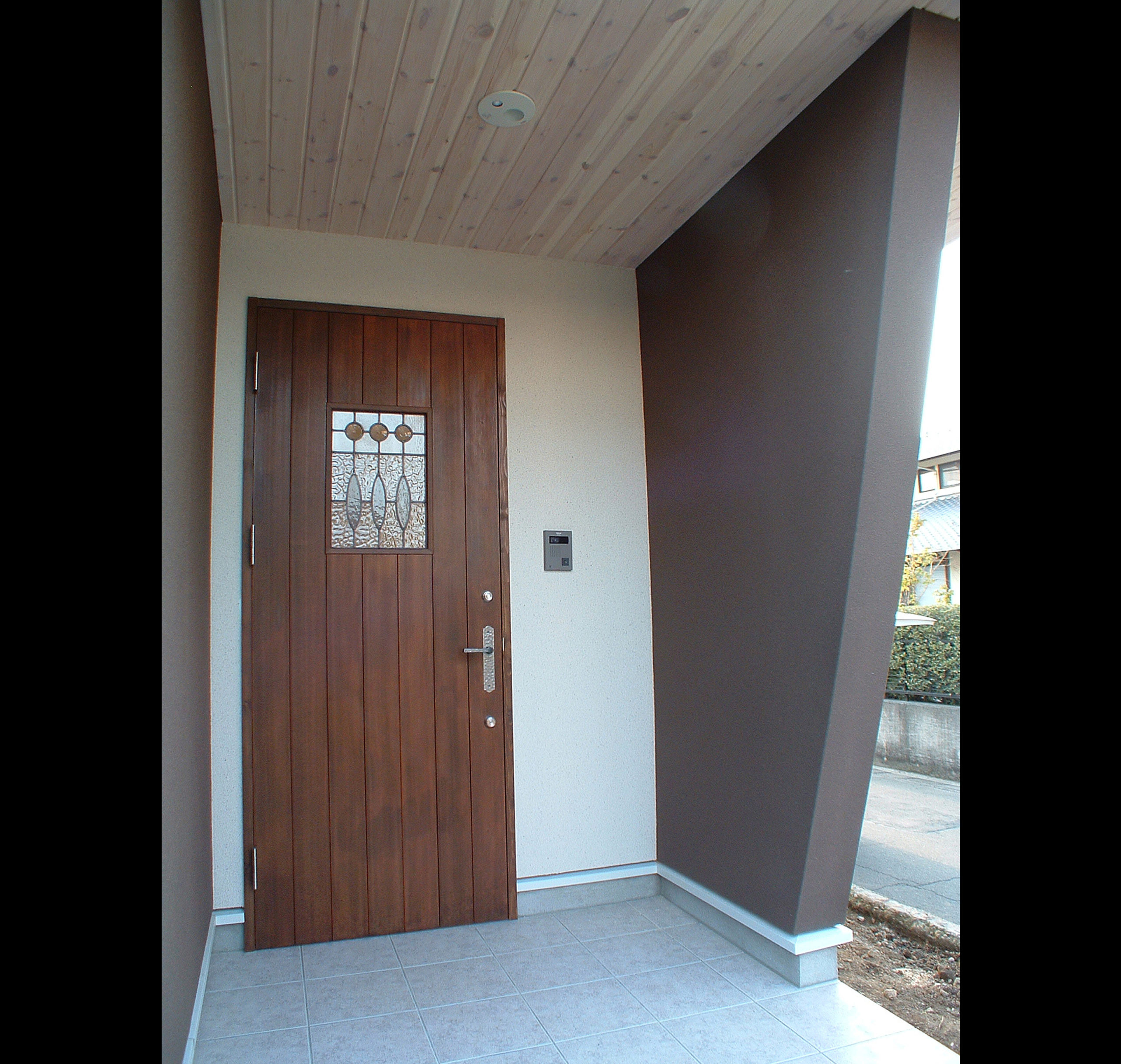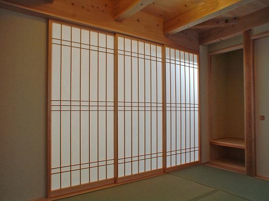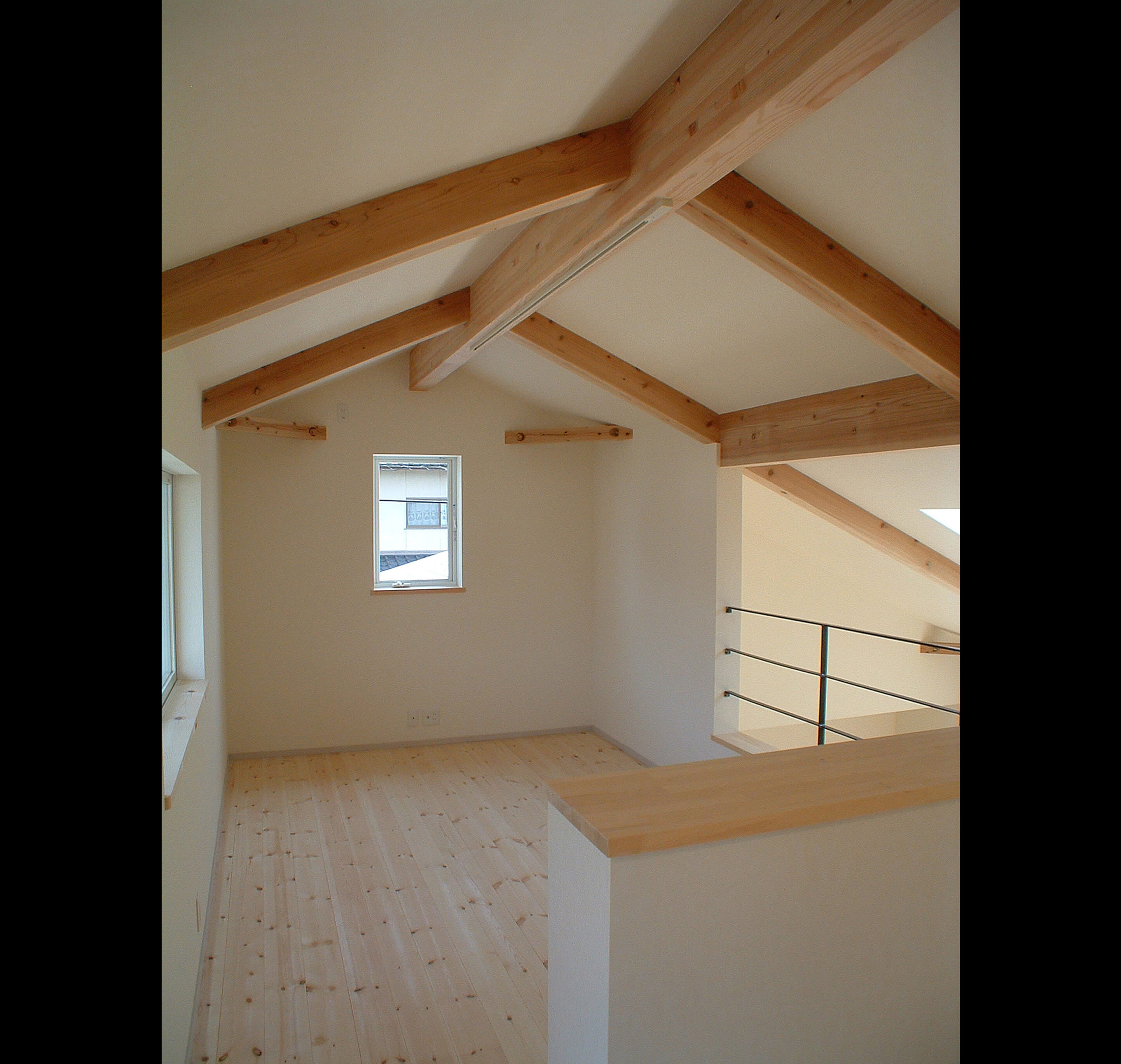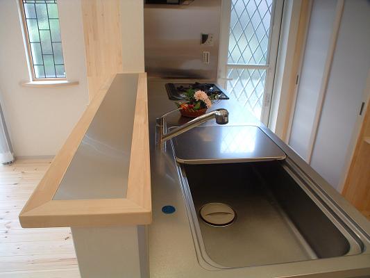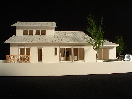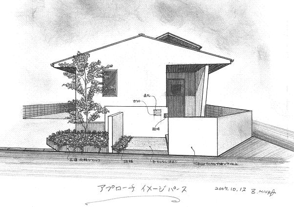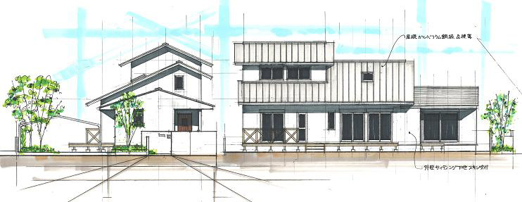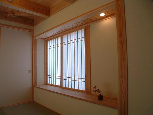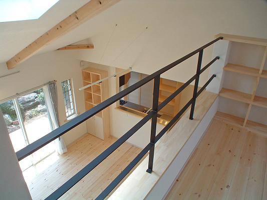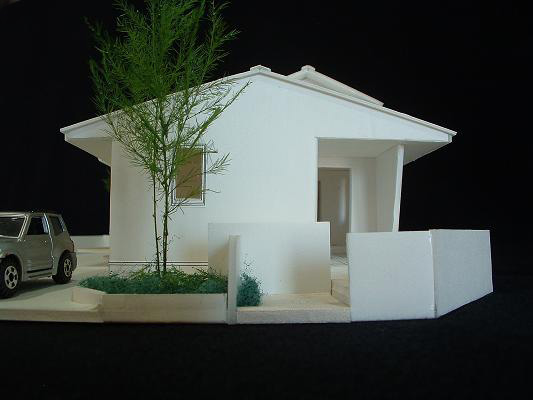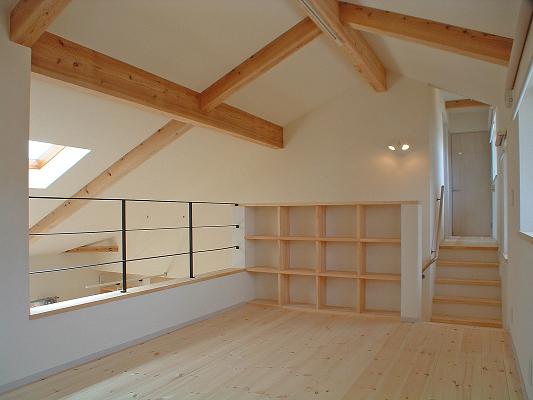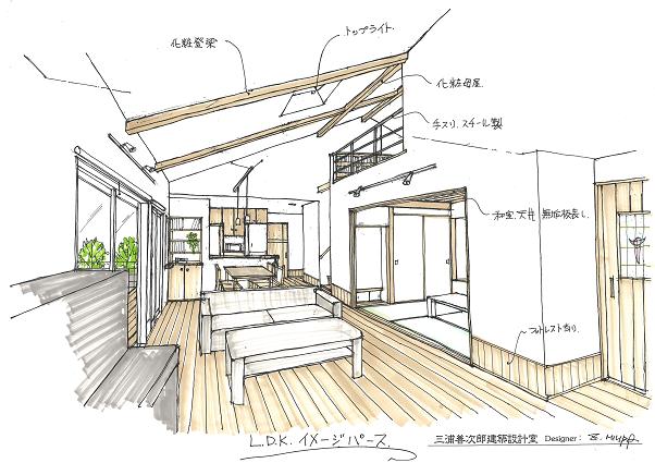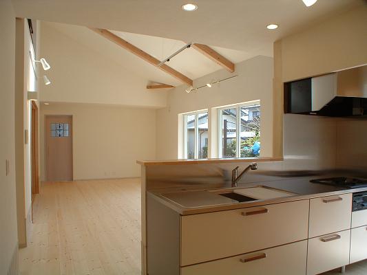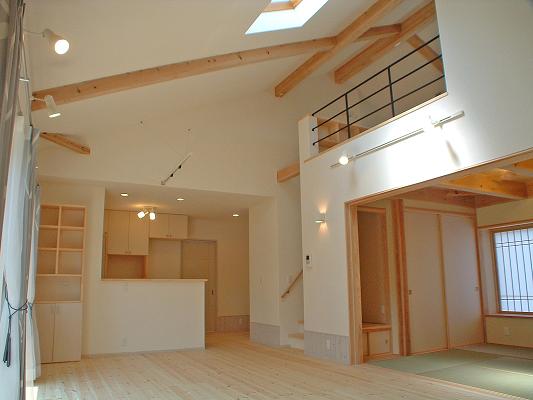 敷地は南向きで東西方向に長く平静な住宅地の一角にある。施主とはステンドガラスの展示会をご縁に知り合った。 高齢者と同居のため、高齢者室のすぐそばにキッチンや水回りを置き、高齢者の生活動線が最短ですむように、また1階は廊下をなくし車椅子での移動もスムーズに出来るようにした。 LDK21帖と和室6帖を続けて使用すると27帖の空間となる。 リビングダイニングの上部には吹抜を設け、吹抜と連続した和室上部の中2階の位置に多目的ホールを設けた。 7.5帖の多目的ホールは子供のプレイルームとして、あるいはご主人の書斎コーナーに、雨の日は洗濯物干し場にとその時の用途に応じて多目的に使用できる。 このスペースは、LDK+アルファーの部分であるが、この空間が家族のコミュニケーションを取る上で重要な役目をしている。 子供は子供部屋に閉じこもることなく、多目的ホールで遊ぶことを意図し、親は子供の気配を感じながら暮らすことができる。