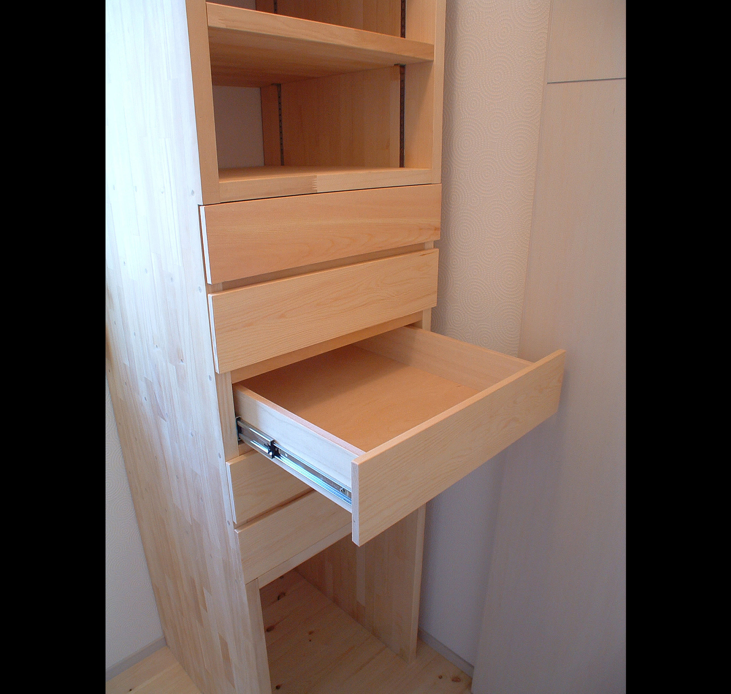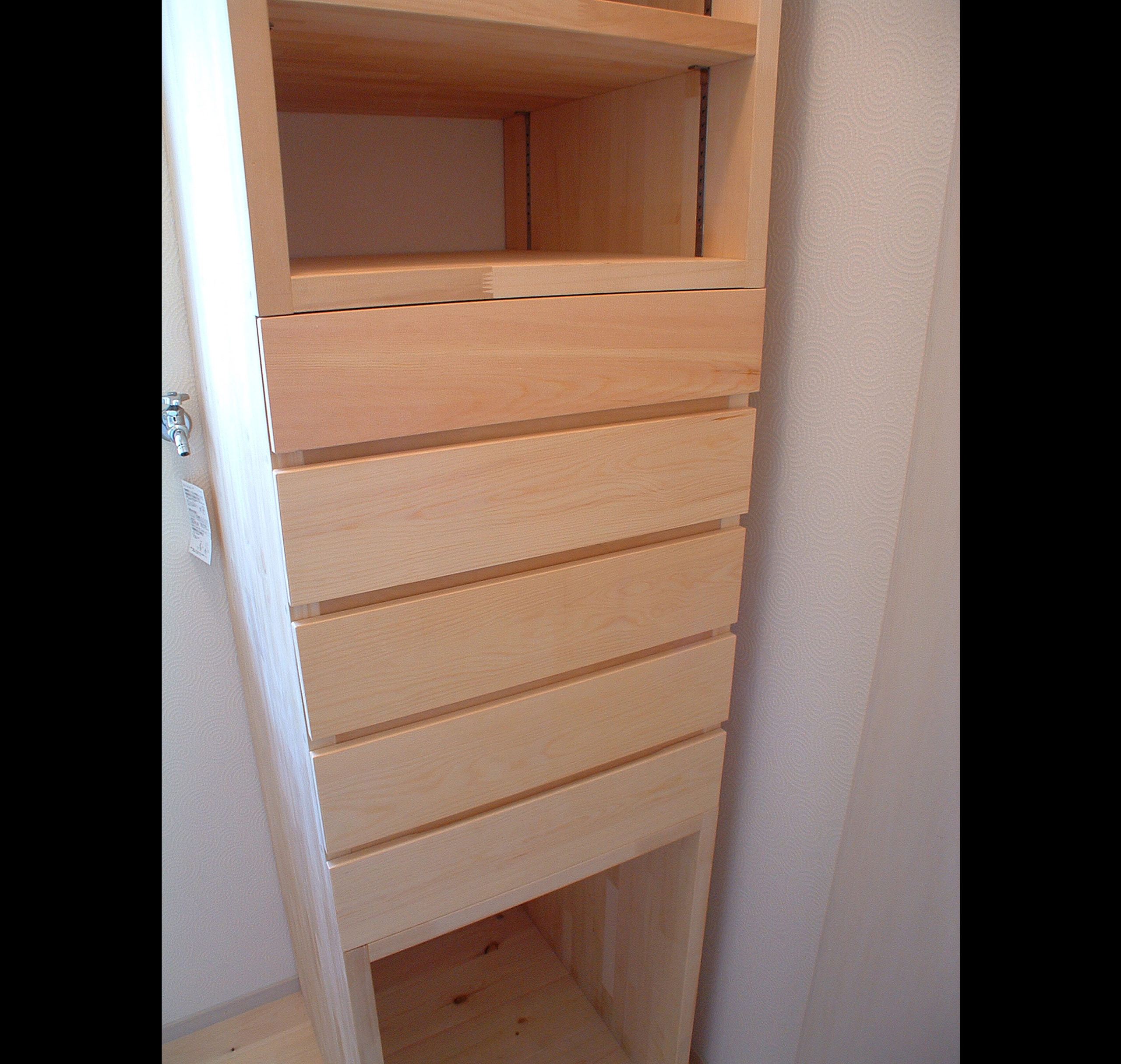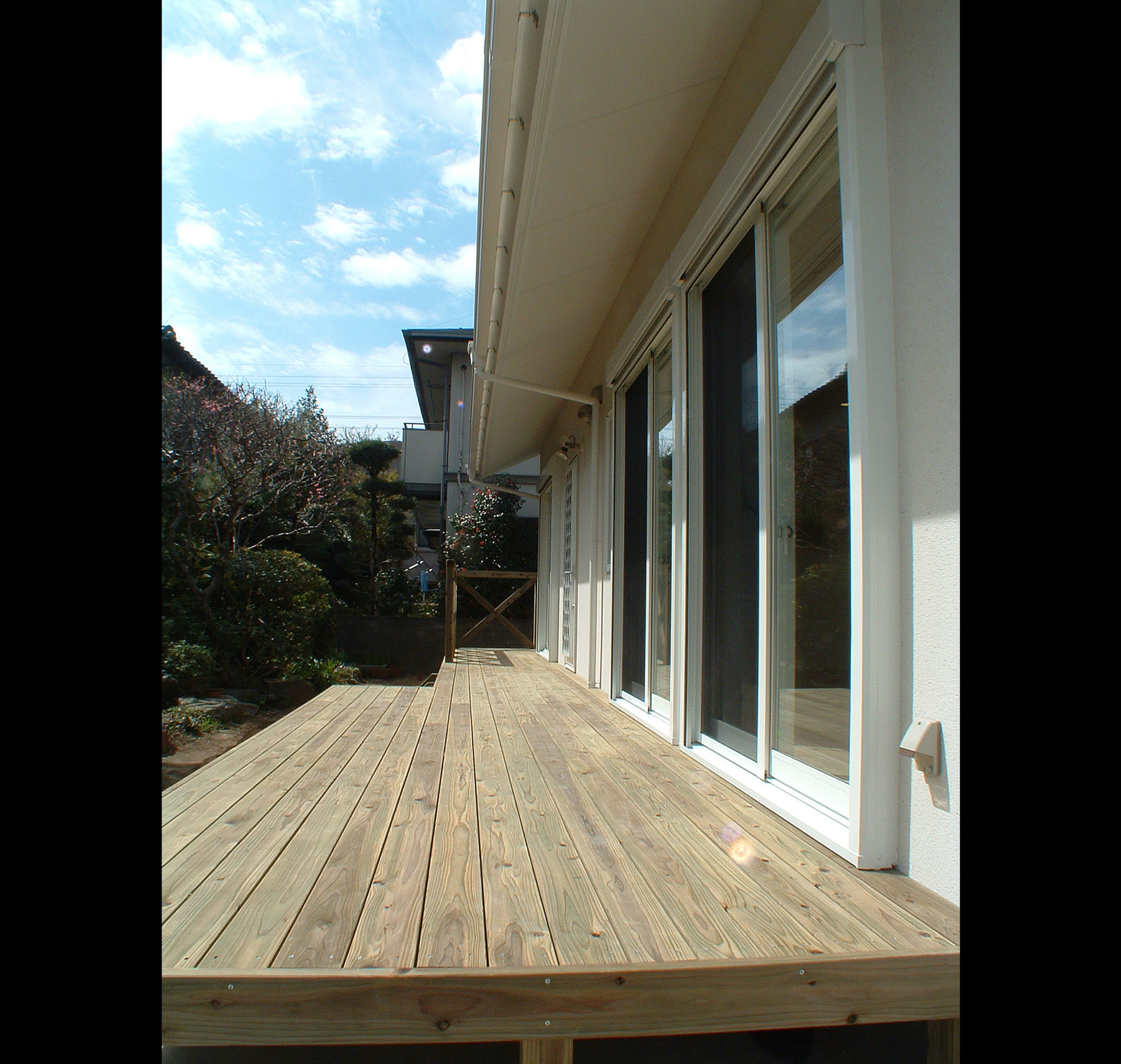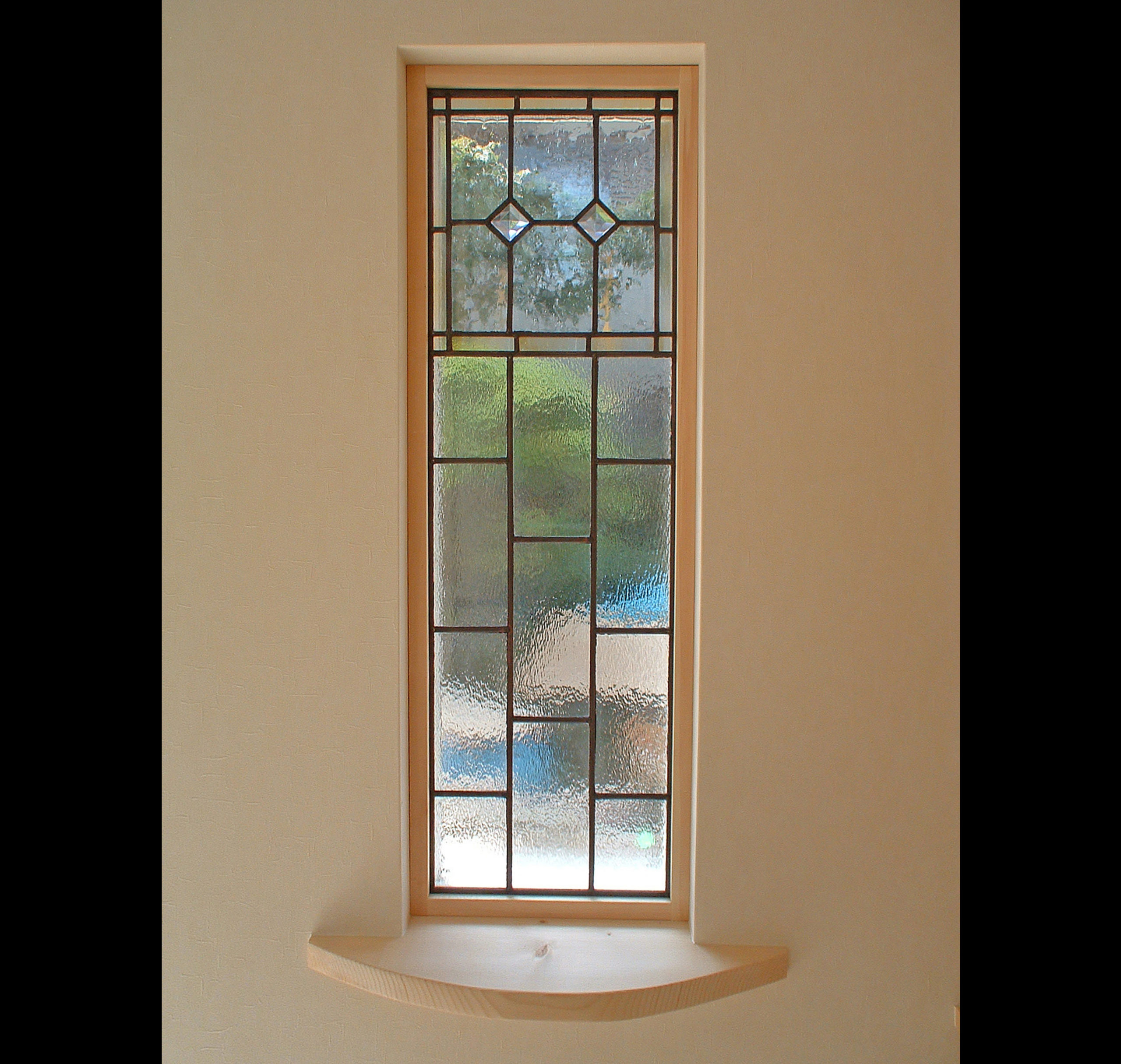 敷地は南向きで東西方向に長く平静な住宅地の一角にある。施主とはステンドガラスの展示会をご縁に知り合った。 高齢者と同居のため、高齢者室のすぐそばにキッチンや水回りを置き、高齢者の生活動線が最短ですむように、また1階は廊下をなくし車椅子での移動もスムーズに出来るようにした。 LDK21帖と和室6帖を続けて使用すると27帖の空間となる。 リビングダイニングの上部には吹抜を設け、吹抜と連続した和室上部の中2階の位置に多目的ホールを設けた。 7.5帖の多目的ホールは子供のプレイルームとして、あるいはご主人の書斎コーナーに、雨の日は洗濯物干し場にとその時の用途に応じて多目的に使用できる。 このスペースは、LDK+アルファーの部分であるが、この空間が家族のコミュニケーションを取る上で重要な役目をしている。 子供は子供部屋に閉じこもることなく、多目的ホールで遊ぶことを意図し、親は子供の気配を感じながら暮らすことができる。